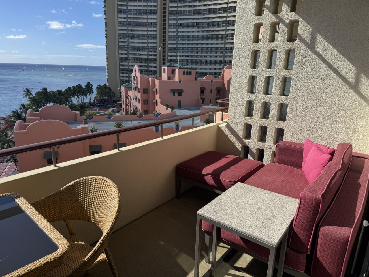 ヒルトンハワイアンビレッジにある37階建ての高層ホテルですが、一部を除いて周囲がホテルの囲まれています。パーシャルオーシャンビューを指定して11階の角部屋に宿泊しましたが、古びたホテルの壁が目の前にあって、かなりがっかりの景観でした。ビルの間からは海が見えるのですが。