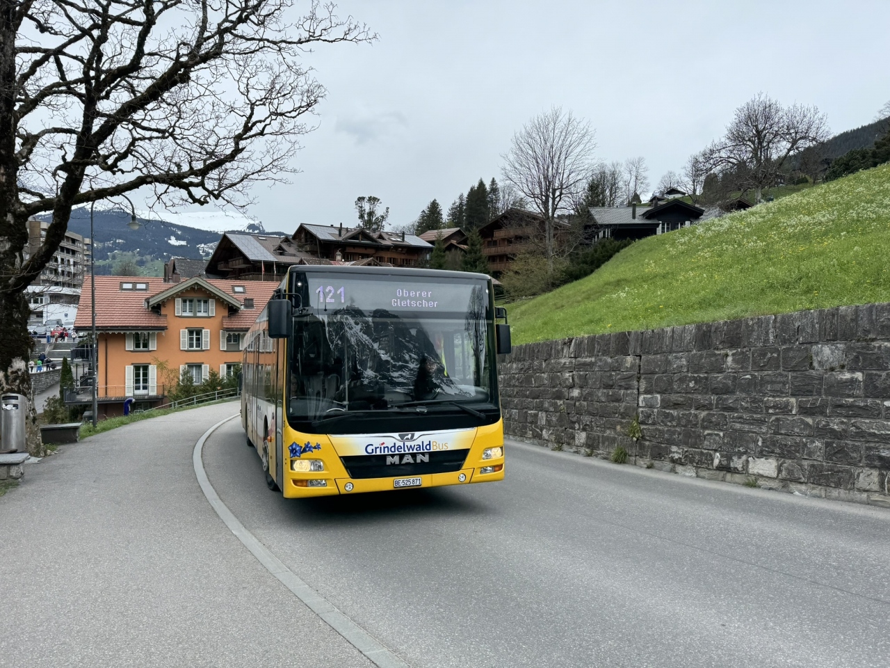 グリンデルワルトの駅前にバスターミナルがあり、3つの系統のバスが出ています。いずれも、グリンデルワルトの街中や近郊を走るバスで、グリンデルワルトのホテルに泊まっている人は、無料で利用することができます(チェックイン時に、ホテルでパスがもらえます)。グリンデルワルトのメインストリートは端から端まで歩いても10分ほどですが、本数は十分にあるので、荷物があるときなどは便利です。