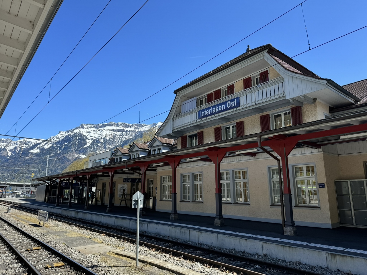 インターラーケンにはオスと駅とウェスト駅があり、オストは「東」という意味です。インターラーケンオストは、スイス鉄道やドイツ鉄道が乗り入れているほか、ベルナー・オーバーラント鉄道など3つの路線も集まっている、アルプス観光の拠点駅になっています。インターラーケンの中心街は、インターラーケンオスト駅から歩いて5―10分のところにあるので、乗り換えのときに、インターラーケンの観光を手軽に楽しむこともできます。