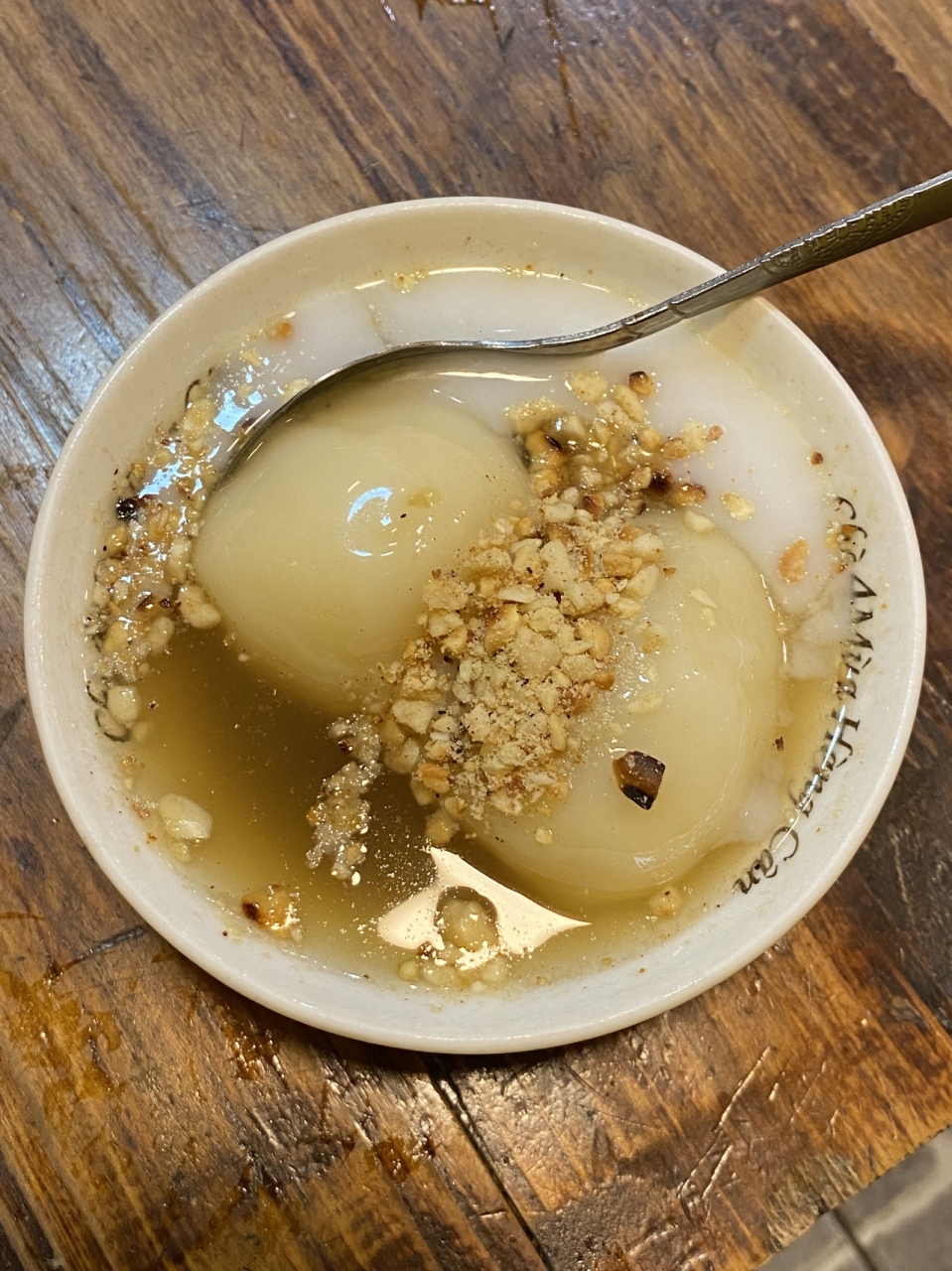 でも雨で寒かった日のためか、注文せずとも店員さんが黒ゴマ団子入りの甘いジンジャースープのチェーを持ってきてくれました。