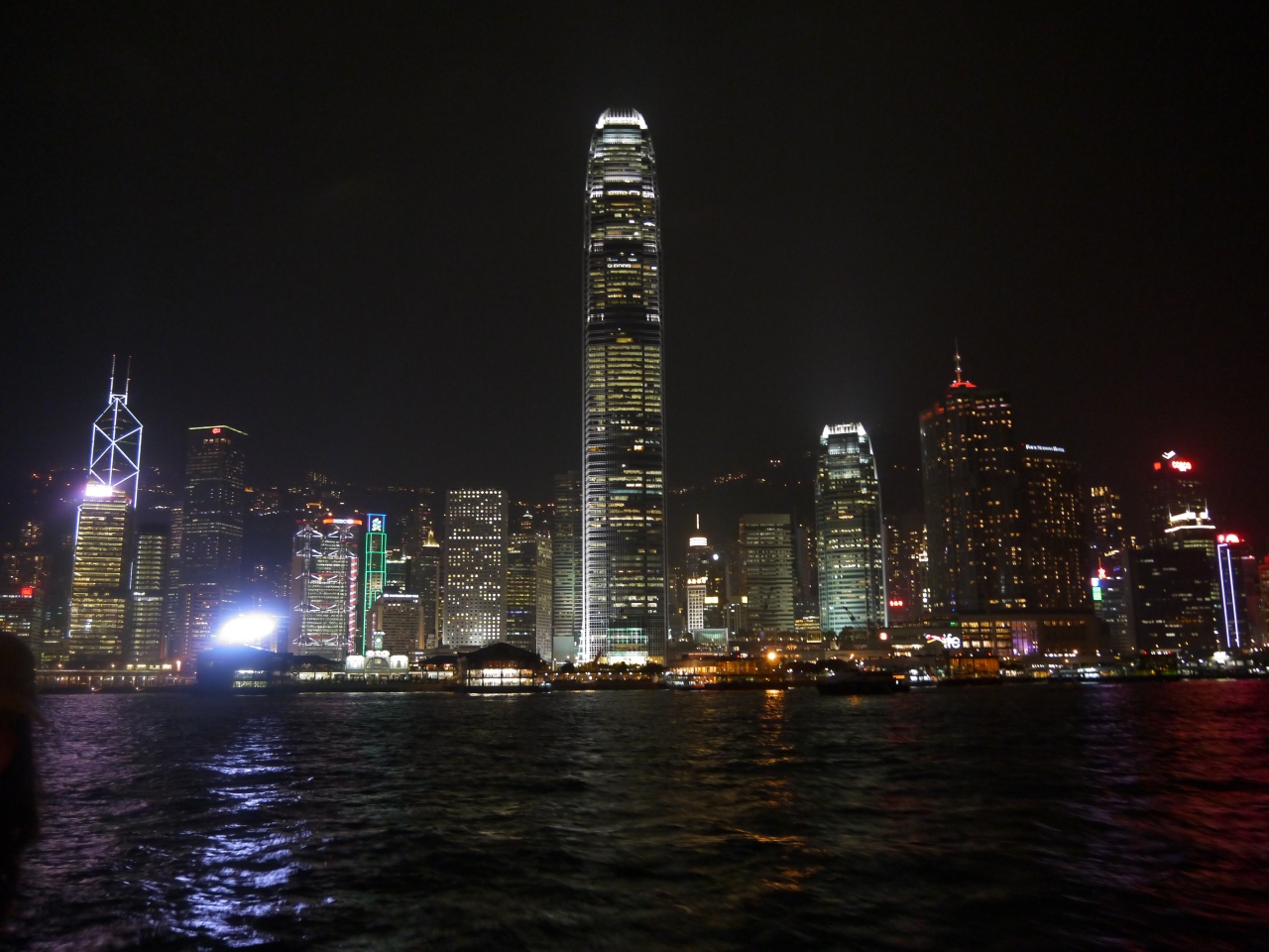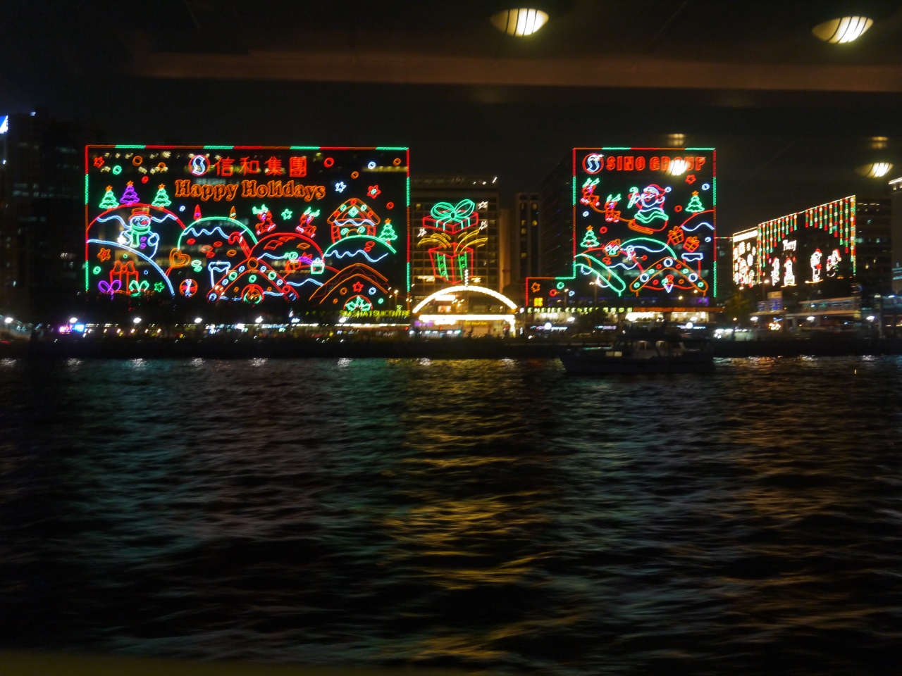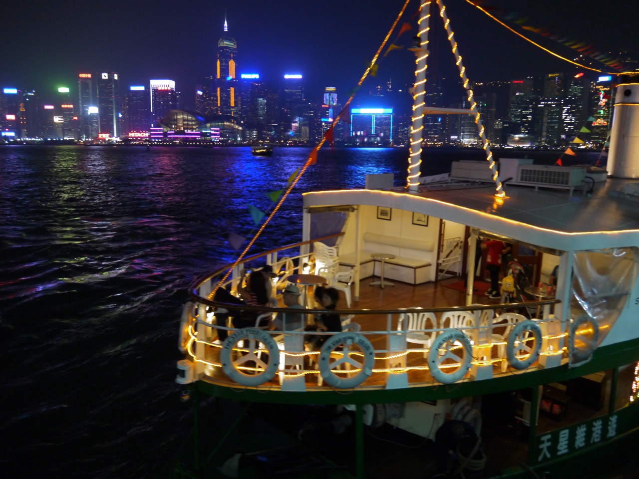 船の上から鑑賞しました。一般的には九龍半島側から香港島側の高層ビルから放たれる光やレーザーショーを楽しみますが船のうえからだと両島の景色が楽しめます。