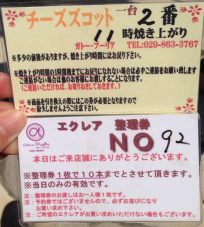 日曜日に行きました。お店は10時開店で、私は9時55分頃到着。エクレア購入整理券92番、チーズコット11時焼き上がり券を頂きました。整理券1枚でエクレア10本購入できます。チーズコット券は1枚で1個分。整理券をゲットしても、そのまま並ばなければいけないようで、皆さん並んでいました。1時間15分程並んで、ようやく購入することができました。エクレアを購入しない人は、並ぶ必要はないようです。