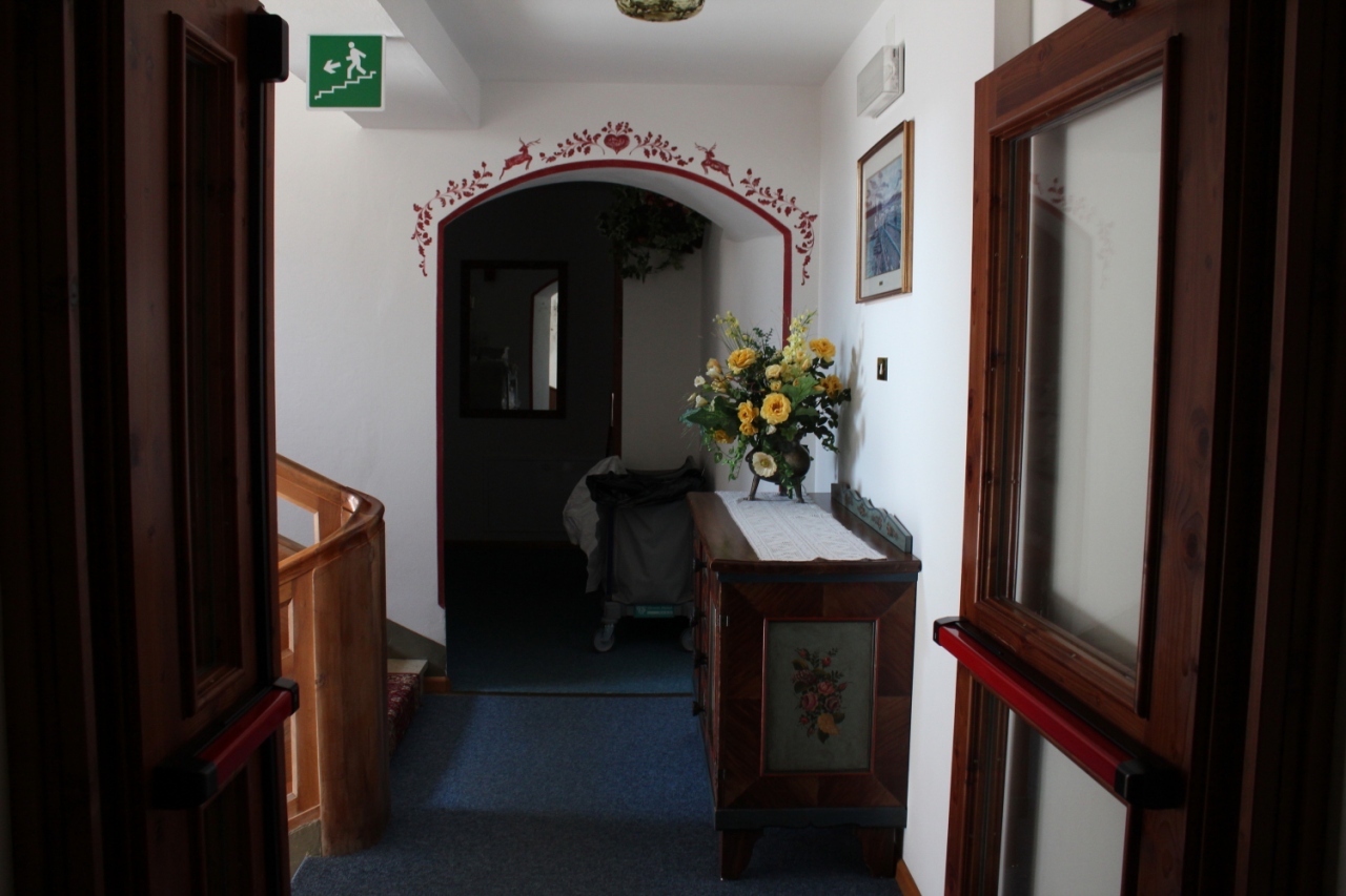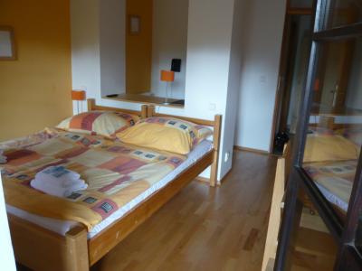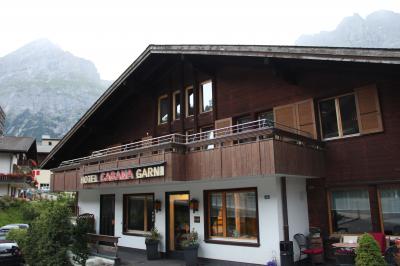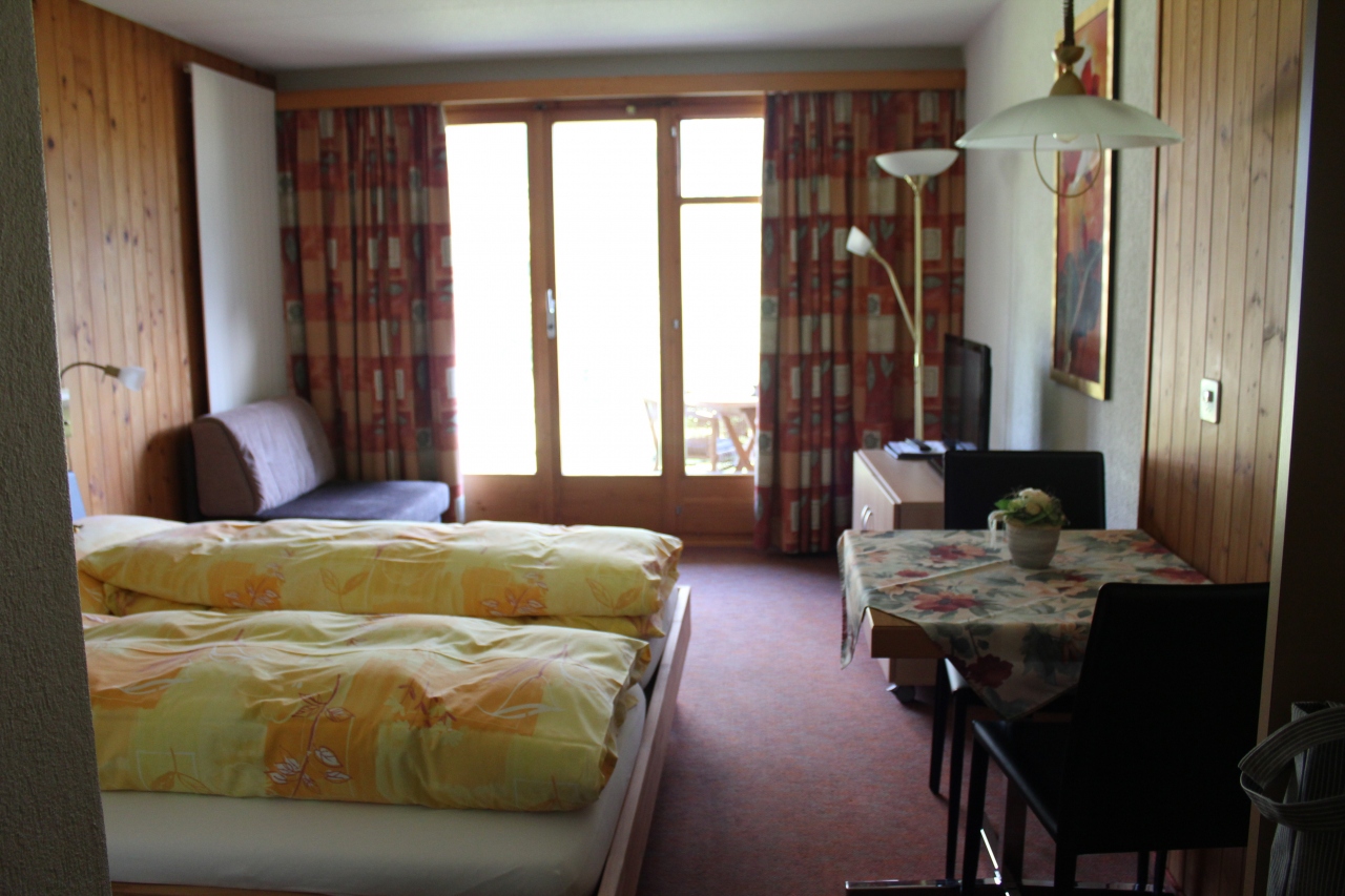駅からは下り坂で7分ほど歩きます。出かける時に坂を登るのが少し面倒ですが、駅前と違ったのんびりとした雰囲気がよかったです。案内された部屋はグランド階(日本1階)で庭がついていて、庭に椅子を出してくつろぐとアイガーに包まれてるようで感激しました。また村と線路が見下ろせて電車が登ってくるのを眺めたりと出かけて帰ってくると庭でよく過ごしました。