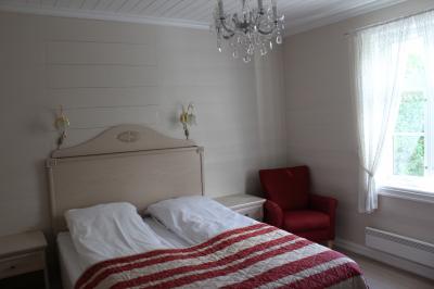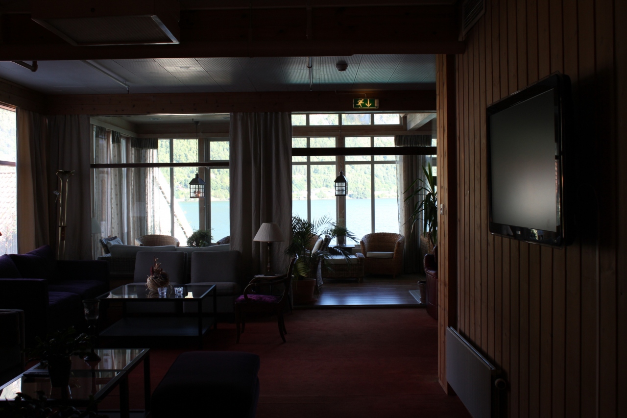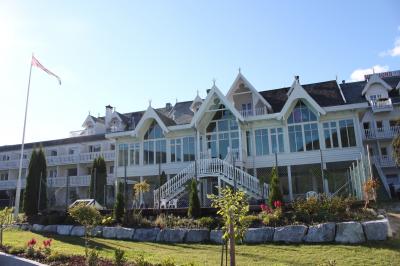 フィヨルド側から見た外観やラウンジは雰囲気があり、庭から見るフィヨルドも気持ちがいい。