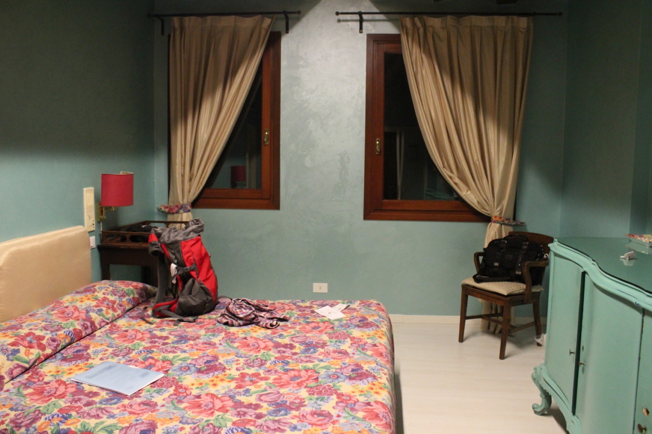 部屋はカントリー風で小さな窓から町、ベランダからスカラが見えます。TV、チェストは付いているけど冷蔵庫は無し。