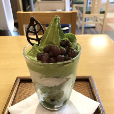 オーダーした宇治茶パフェデラックス翠は、底に抹茶寒天、抹茶アイス、生クリーム、抹茶カステラ、わらび餅、抹茶ソフト、白玉、あんこが乗っていて680円とコスパ最高。