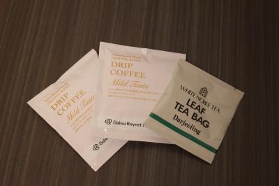 室内には独立型のドライヤーやスマホ用の充電器があり、ドリップ式のコーヒーパックや紅茶もらえて気が利いています。