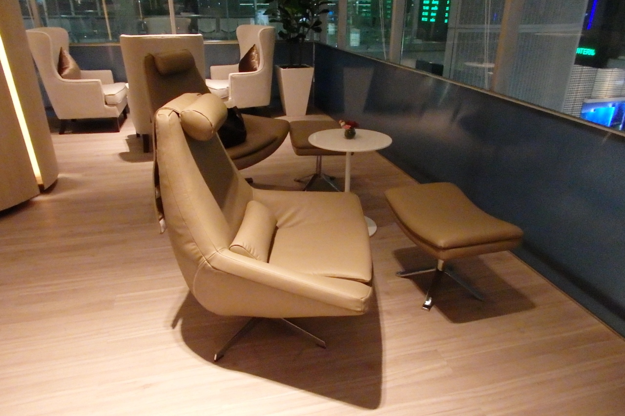 コンコースG、キャセイラウンジが閉まっていたため、その先に寄りました。2階層となっています。エスカレーターで1-2階がつながっています。午後10時過ぎの時間では上昇側に、ロープがありました。椅子はゆったりしています。