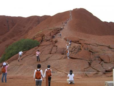 雨が降っていたり、頂上で風が強かったり、37度以上になると予想されたりで、ゲートが開くのは10%くらいらしい。午前の早い時間帯が登りごろ。傾斜30-40度。砂地がなく、草木は途中や頂上にはなく、ハイキングや普通の登山とは異質のもの。軽石風の表面はすべりにくいので、スニーカーでOKだが、それでも転がり始めると途中で止まるのは困難だろう。太目の鎖を頼りに、ゆっくり皆と列になって登って行くのが無難。少し太めの中年男女も多く、限界に挑んでいる。急勾配を抜けると、2-3mのアップダウンが15分くらいある。ここは、ゆっくり行くと、登りがきつい。健脚自慢は、くだりで勢いをつけ、ササッと登るとよい。遠くにマウントオルガと反対にマウントコナーが見える。二つ一度に見える地上は、ここだけか??