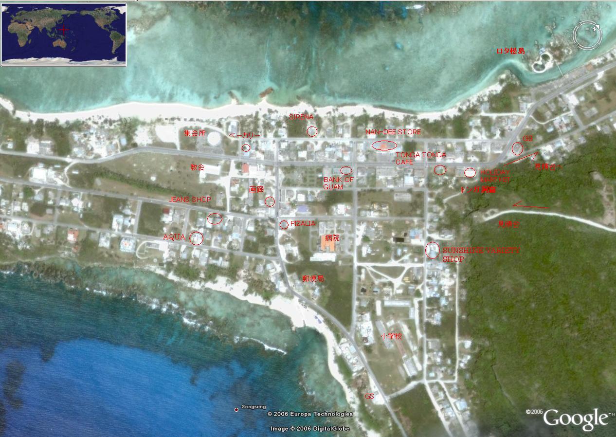 3)マーケットも数件回りましたが、規模はどこも大きくはありません。トンガ洞窟を南に坂道を上がったところに、SUNSHINE VARIETY SHOPというお店がありました。窓がなく、一見するとスナックかクラブに似た胡散臭そうな外見でしたが、入ってみると、まともな雑貨屋さんでした。日用雑貨を主体に、ロタ1かと思える品ぞろえでした。昔の万屋さんといった感じ(わかるかな?)。名鉄ストアは消えたよう。村の中心に新たに何か作っていたので、スーパーかもしれません。(画像の解像度が低く、記入した注釈、名前が読めませんね、ごめんなさい)- 旅行時期