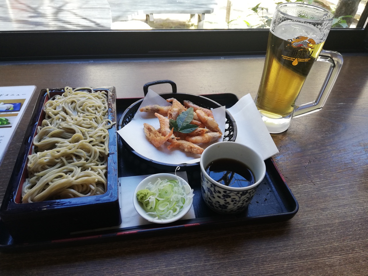 お風呂上がりには食事処でビール、海老の唐揚げにせいろを食べました!