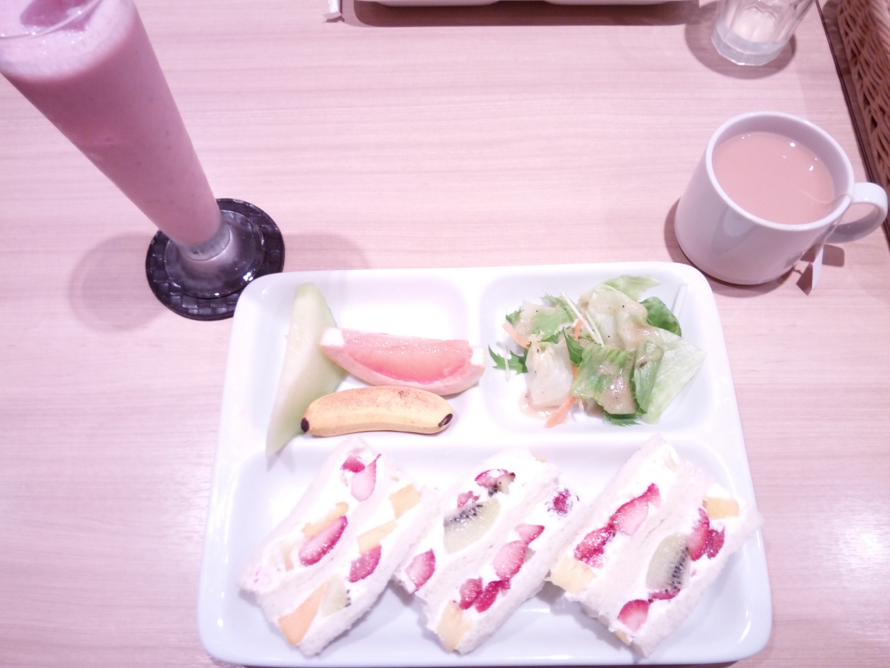 いろいろなフルーツがたっぷり入ったフルーツサンド、生クリームも絶妙で、朝から幸せ。フリードリンク(コーヒー、紅茶など)もついて880円。
