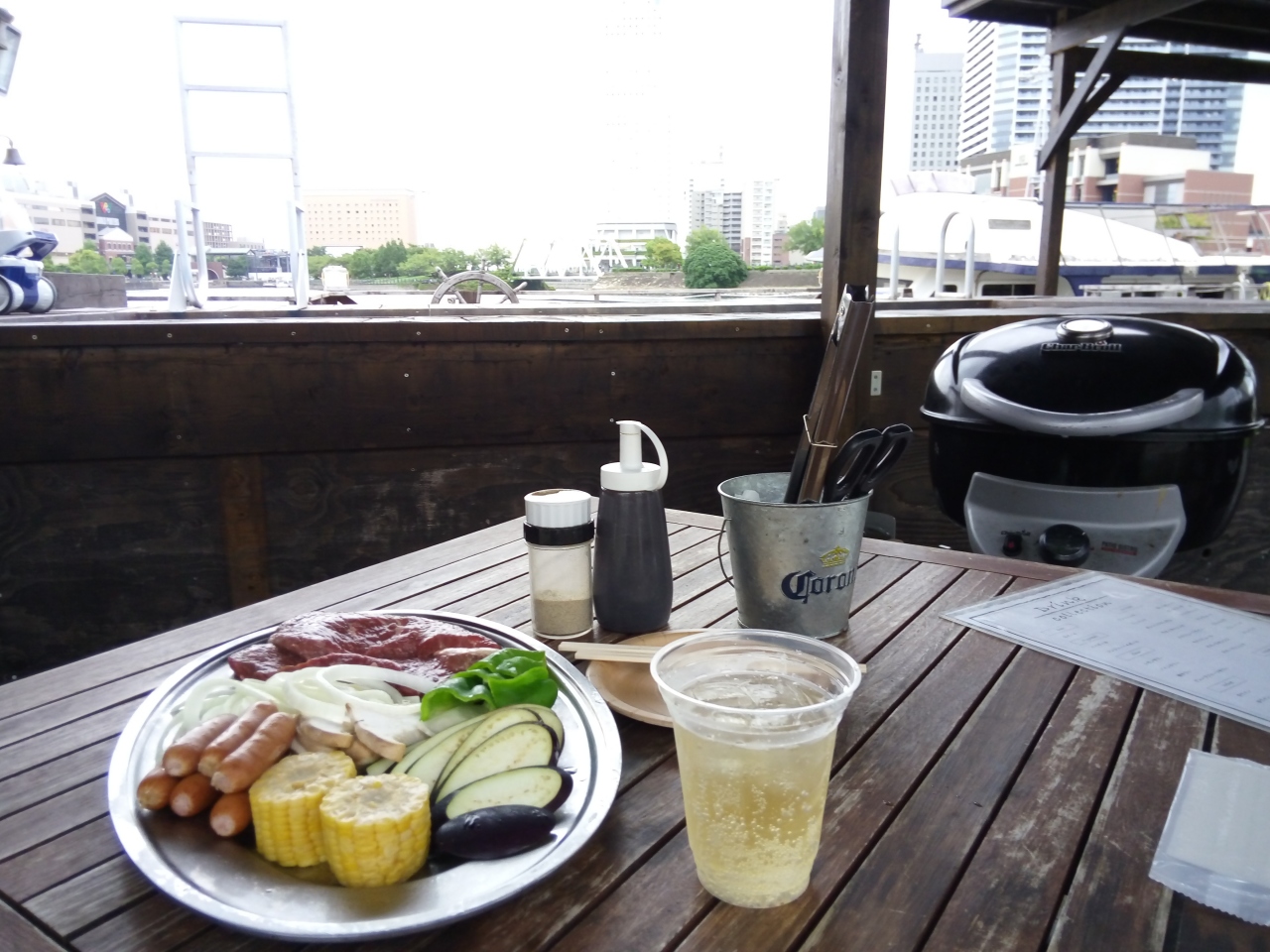 お肉はランプ肉で、おいしかったです。ドリンク(飲み放題)のお代わりは店内バーにもらいに行くシステムで、デッキ内をビューを味わいながらの行き来も楽しいです。