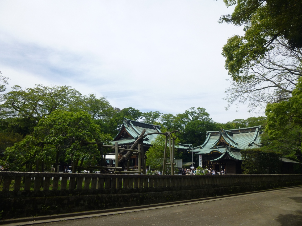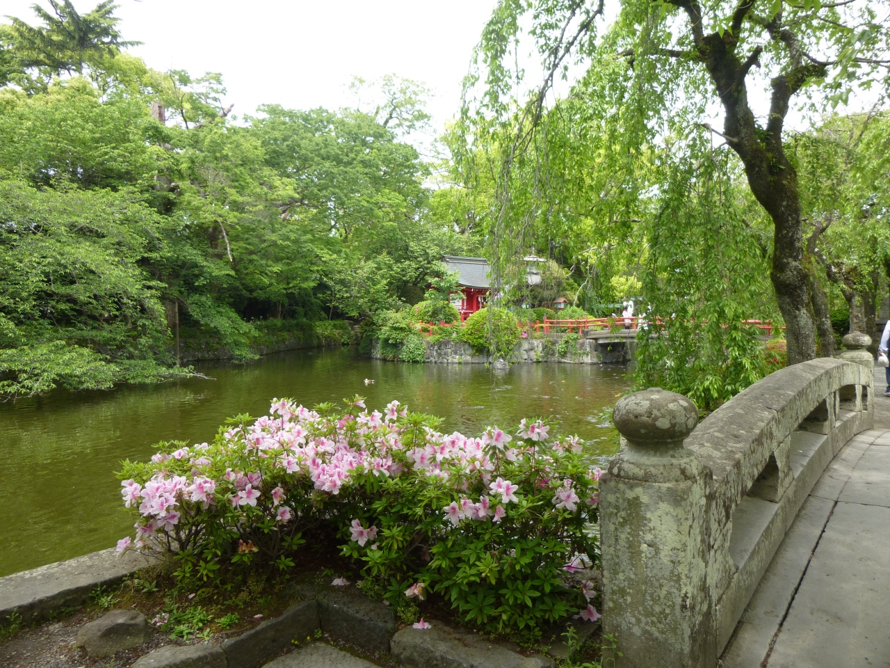 石の鳥居をくぐると、神池、石橋などがあり、緑あふれる広い境内です。