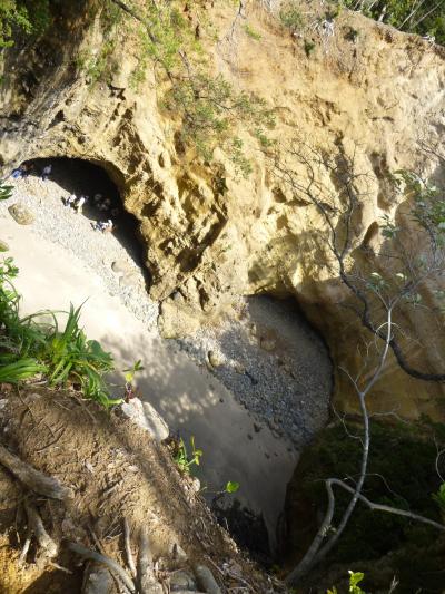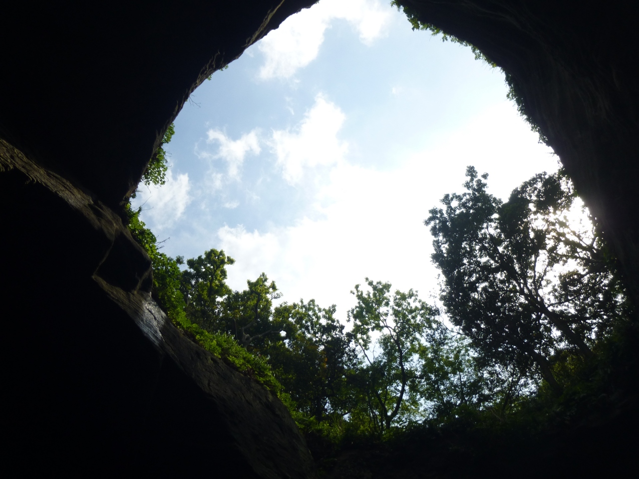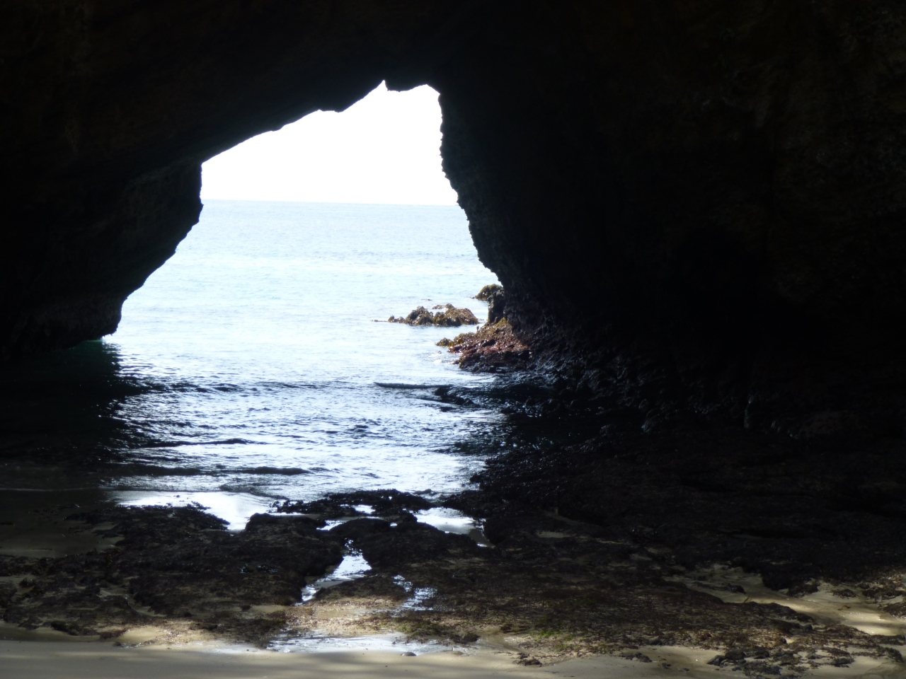 洞窟の穴の向こうには海が広がりキラキラと輝き、一部崩れ落ちて開いた天窓からは太陽が注ぎ込む、神秘的な空間です。