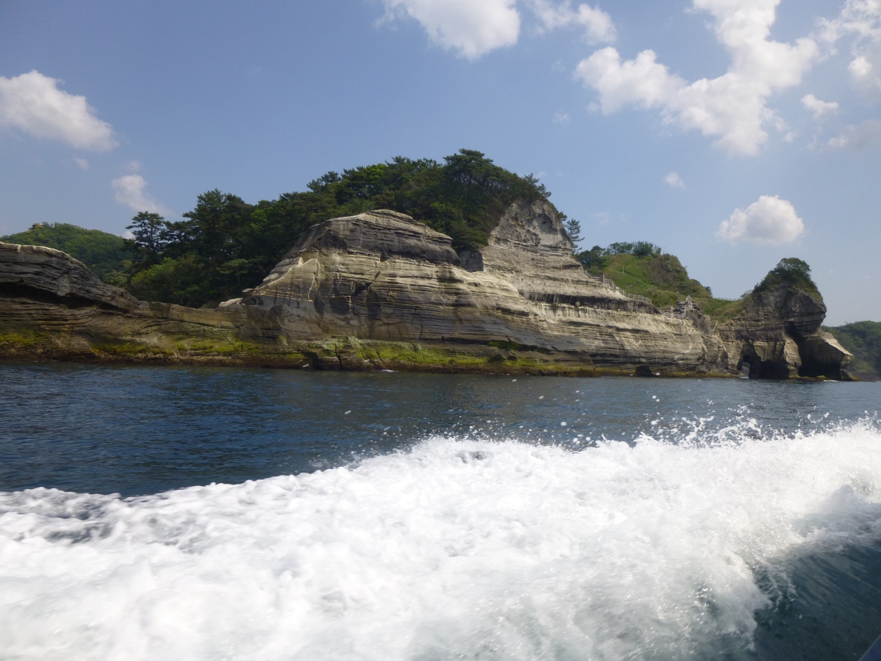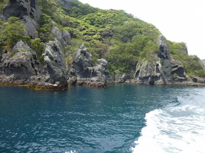 折り重なる火山灰層が美しい崖を間近に、水しぶきを上げて進み、爽快です。