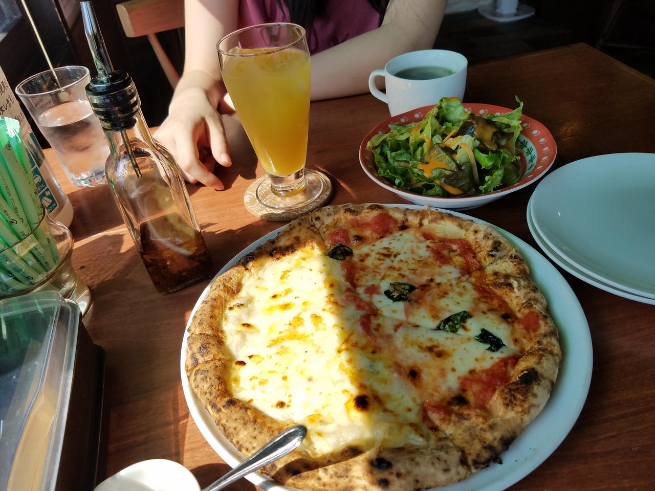 マルゲリータ&クアトロフォルマッジのハーフ&ハーフセットを注文。ミニサラダ、わかめスープがついて1400円。クアトロは4種の濃厚チーズにハチミツをかけて食べると一層美味しさが際立つそう。- 旅行時期