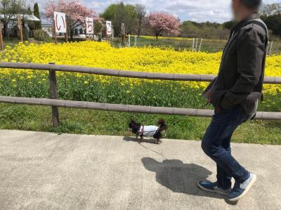 相方1号と2号が菜の花畑の前を気持ちよさそうに散歩しています。