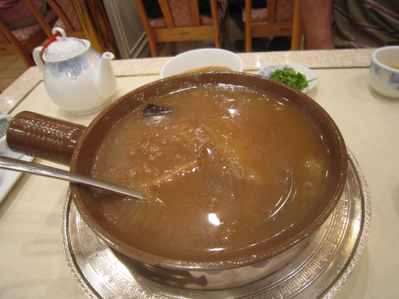 フカヒレは、鍋に入って熱々の状態で提供されます。味は噂に違わずとても美味しいです。味付けがしっかりしていて、そのままいただくも良し、ご飯と一緒に食べるも良し、です。