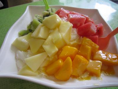 総合カキ氷をいただきました。スイカ、キウィ、りんごなど乗っていました。やっぱり、マンゴーが一番でした。