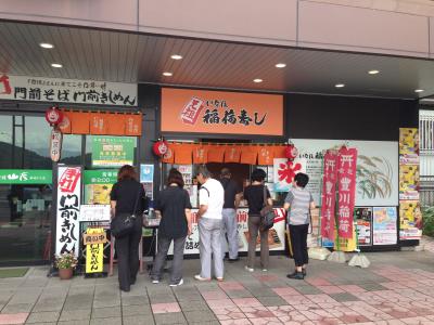 豊川稲荷ののぼりが立っていて、豊川稲荷寿司や門前そばなどの店先にはたくさんの人がならんでいます。