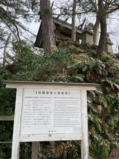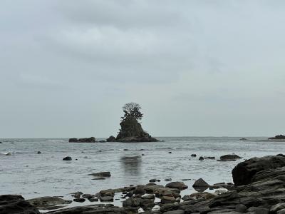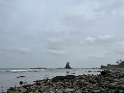 富山駅前からレンタカーで向かいました。道の駅雨晴の駐車場を利用しました。道路と線路を渡ると砂浜に出ることができます。海越しに立山連峰の山々を見ることができる絶景を期待していきましたが、残念ながら曇り空で立山連峰を見ることはできませんでした。義経岩や女岩などがあり十分に楽しめました。