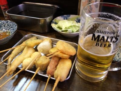 大阪市営地下鉄の御堂筋線「動物園前駅」から徒歩で5分程度です。駅から通天閣に向かう道(たくさんの飲食店が立ち並ぶ)の途中にあります。正午少し前でしたので店内は空いていましたが、店を出るころには満席になっていました。かなりの本数の串カツを食べましたが、脂がくどくないため胃腸はもたれませんでした。飲み物はビールやハイボールがおすすめです。