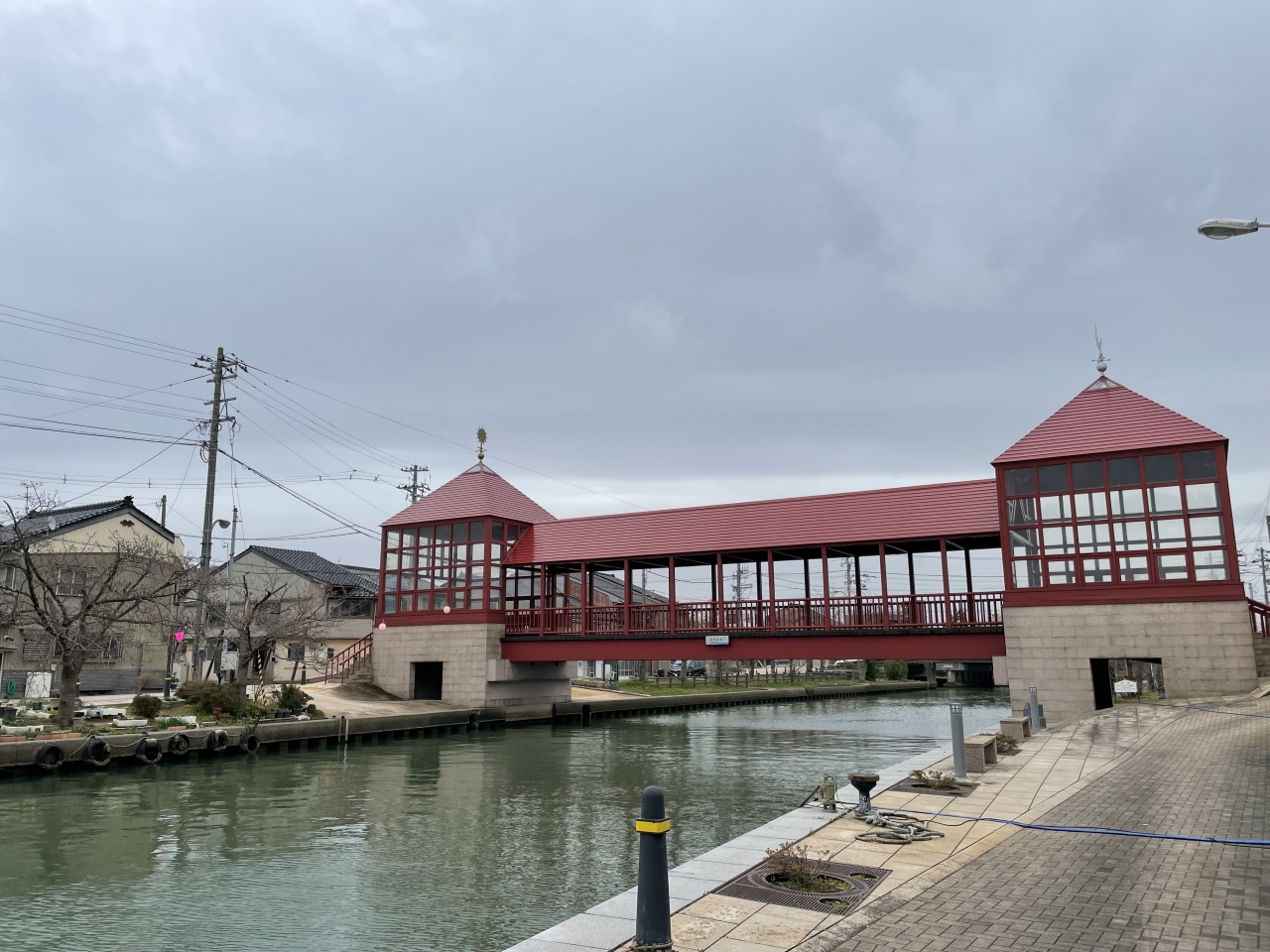 富山県への旅行の際に訪れました。射水市のベイサイドある新湊の観光で内川沿いをレンタサイクルで巡りました。川の駅新湊から出発して川沿いを走っていると赤い色のかわいらしい橋が現れます。歩行者専用の橋で、両端が憩いの場になっています。