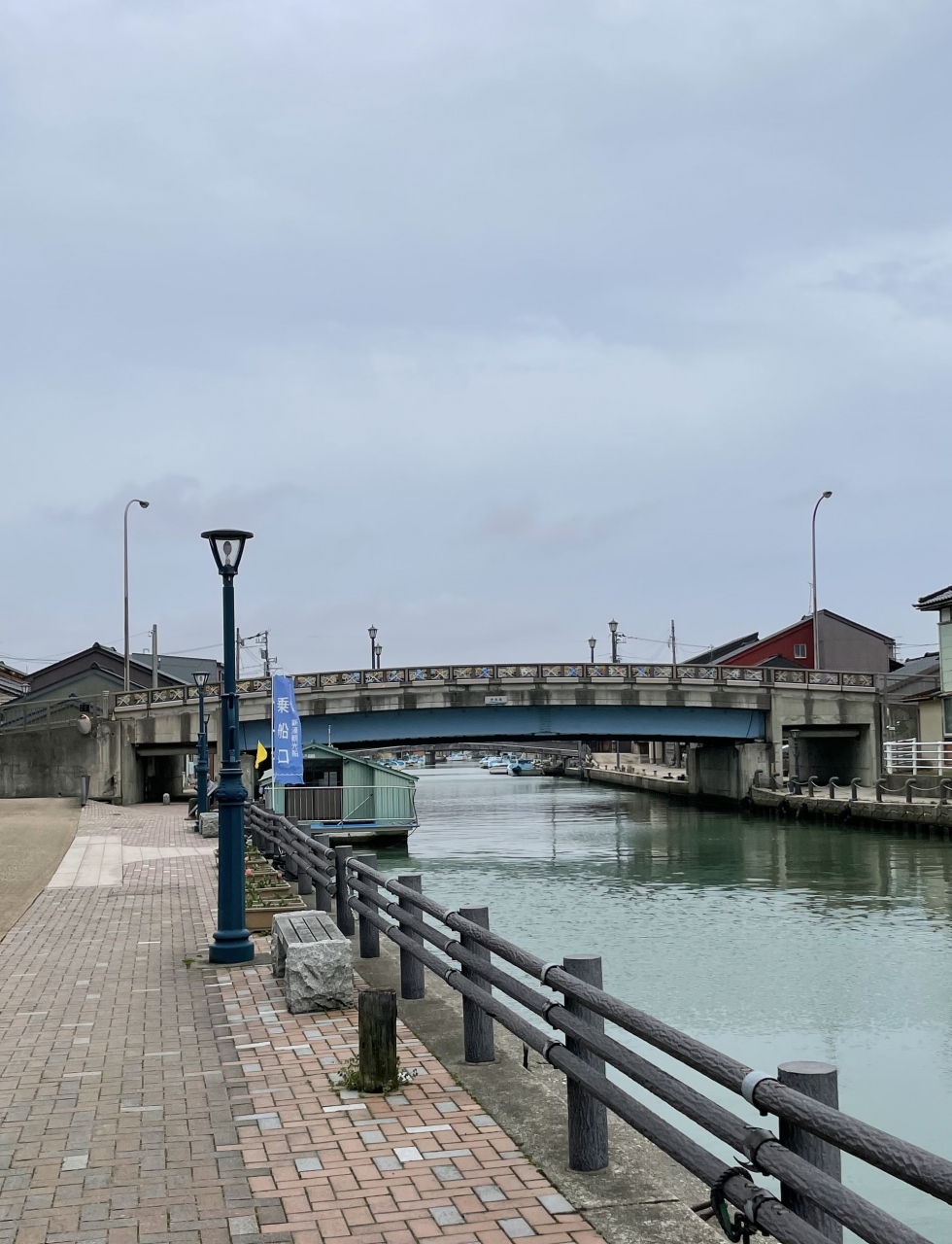 富山県への旅行の際に訪れました。射水市の新湊観光で内川沿いをレンタサイクルで巡りました。川の駅新湊から富山湾方面に向かうと最初に現れる橋です。橋の下側は水色です。橋の上側はステンドグラスになっています。チューリップなどが描かれていて楽しいです。