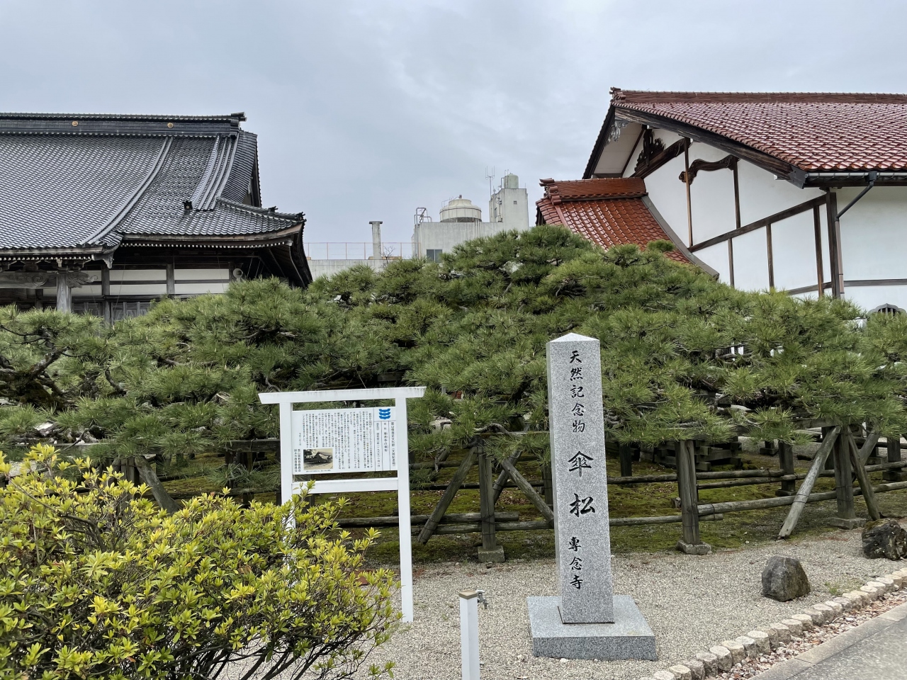 富山県への旅行の際に訪れました。レンタサイクルで新湊の内川沿いを観光しました。川沿いの道から一本入った道路沿いに入り口があるお寺です。天然記念物の傘松があります。まさに傘のように広がった松の木で、とても立派で見ごたえがあります。