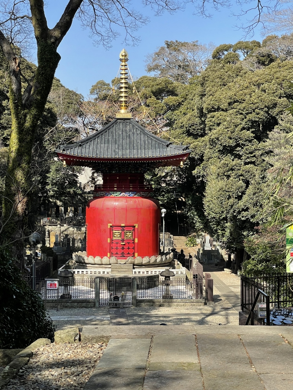 JR川崎駅から五反田駅行きのバスで向かいました。本門寺裏バス停で下車して歩いていきました。池上本門寺の境内にあります。日蓮聖人が火葬に付されたところ建っている木造の塔です。本門寺の境内では国道1号線に近い場所にあります。