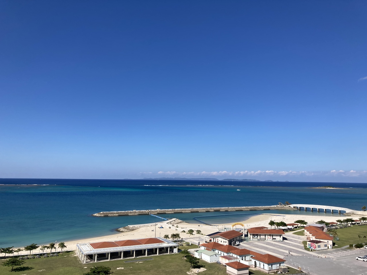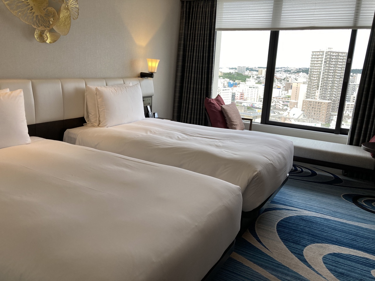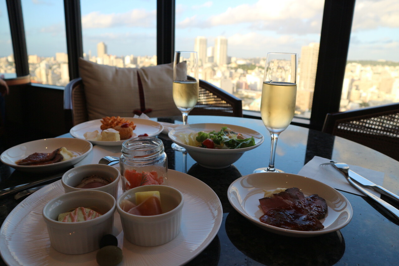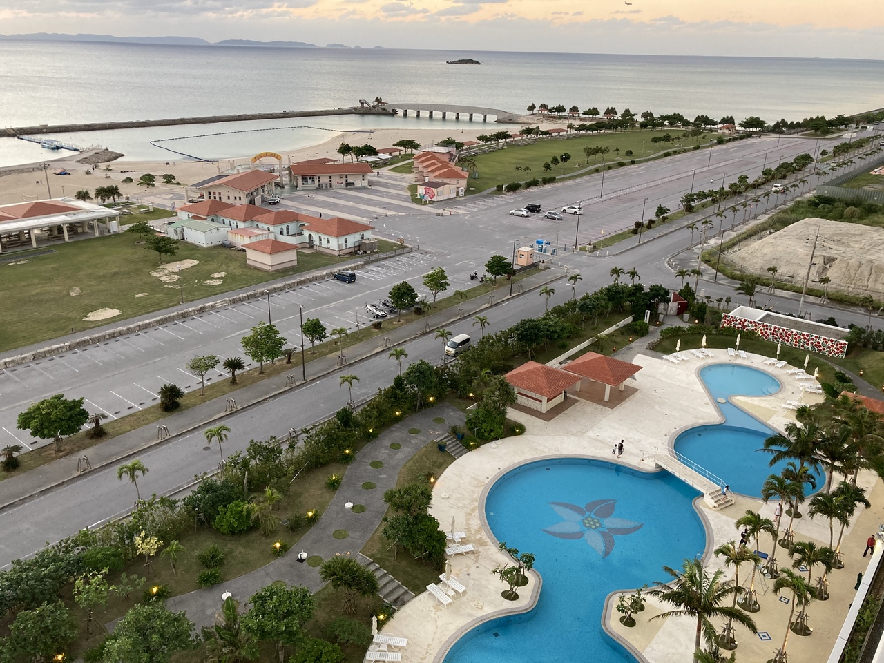 那覇空港から車で約20分のリゾートホテルです。プールもビーチも利用できてオーシャンビューで夕陽や飛行機の着陸も楽しめます。今回はプレミアムラウンジ付きのフロアでゆったりと過ごせました。ティータイムのパンケーキにカクテルタイムの冷製オードブルが良かったです。ここのラウンジの営業中はビール、泡盛はいつでもいただけます。
