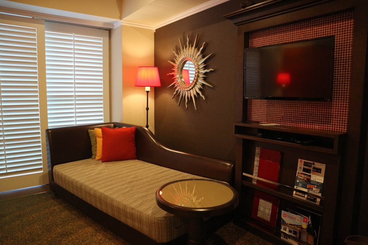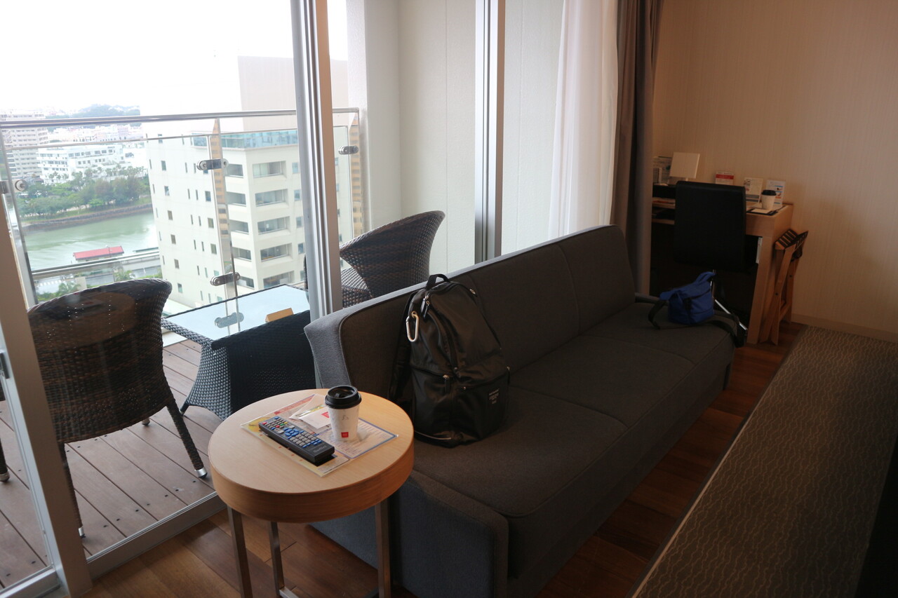 翌朝、那覇空港に向かう為に駅直結のホテルを選びました。旭橋駅から長い連絡通路を5分ぐらいかかります。ホテルが見えてこないのでかなり長く感じました。ビジネスホテルですが、ゆっくりしたかったのでデラックスタイプの部屋にしました。バルコニーにソファーがありゆっくりできました。国際通りにも徒歩で移動できます。