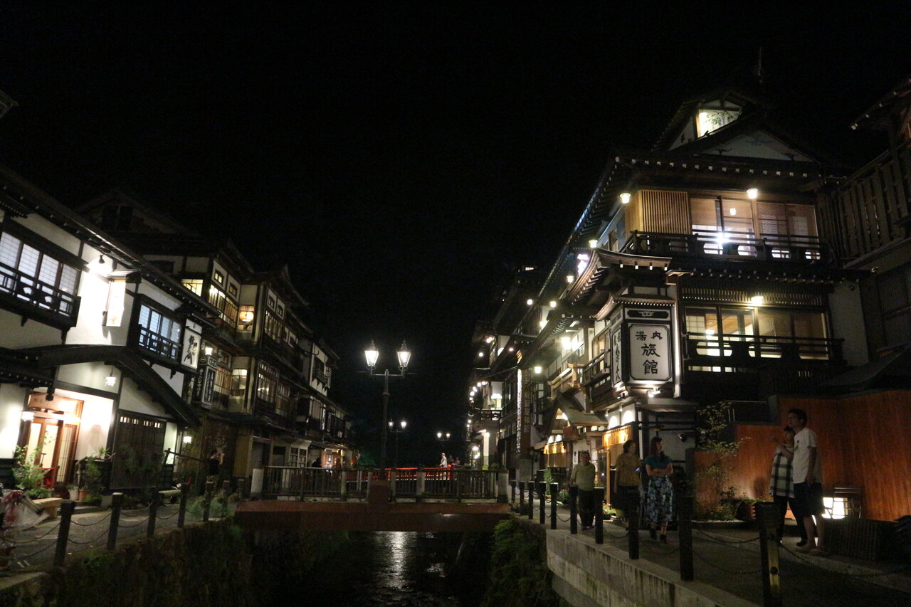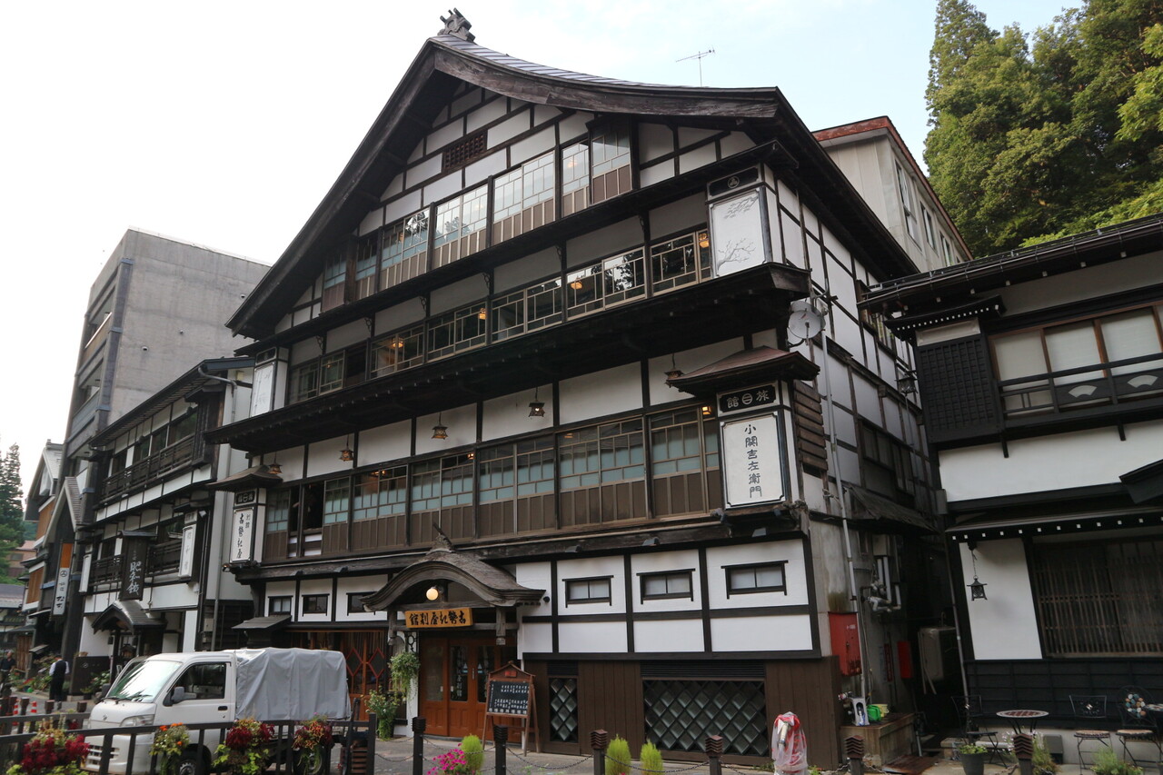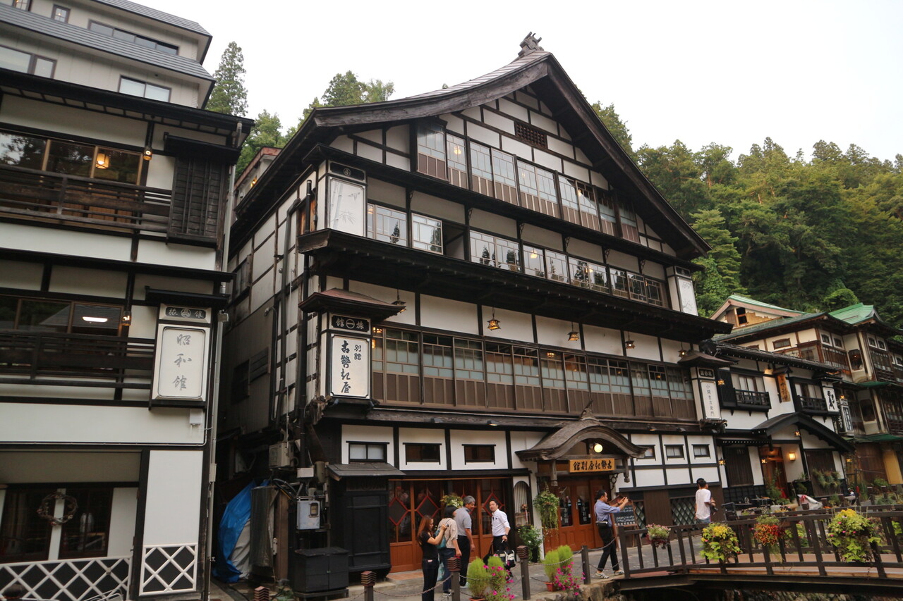 銀山温泉の真ん中に位置する旅館です。部屋は最上階5階の改装されたレトロな雰囲気でトイレ付きでした。部屋からの眺めは隣の建物でした。温泉は2つあり時間によって男女入れ替わりがありました。お料理もどれも美味しかったです。浴衣で下駄を履き温泉街を散歩するのがとても良かったです。夕方になるとガス灯がつき日帰りの観光客も少なくなりゆっくりできました。
