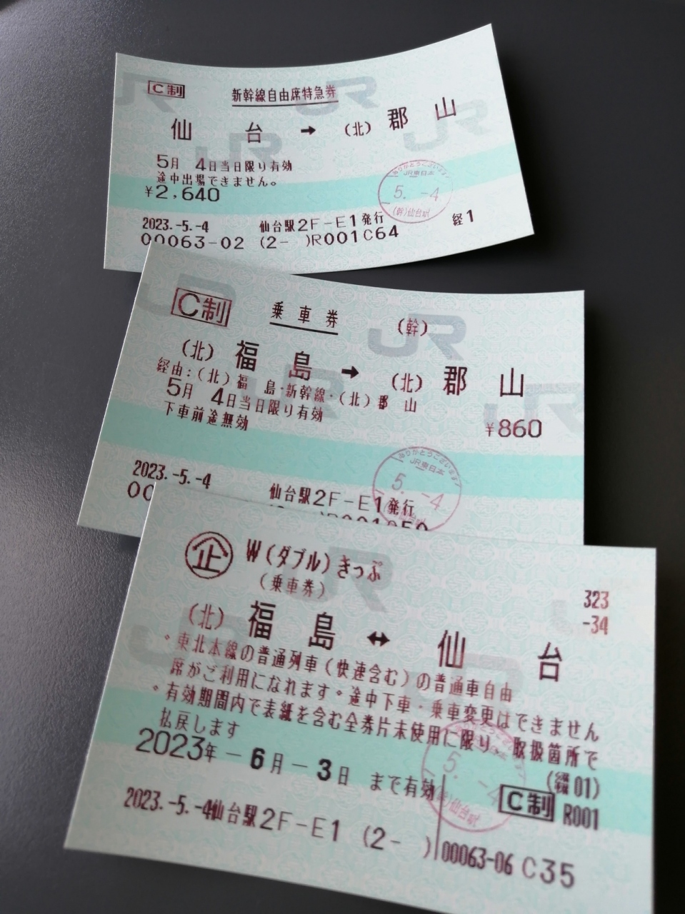 今年のGW旅行の行き先は福島にしました。大阪からだと東京で新幹線を乗り継いだ方が、時間的にも金銭的にも良いかとは思いましたが、飛行機に乗るのが好きなので伊丹空港から仙台空港を利用しました。仙台駅から郡山駅まで、東北新幹線で移動しました。Wきっぷは、仙台駅から福島駅までしか仙台駅では購入できないので、福島駅から郡山駅までの乗車券と新幹線の自由席のチケットをみどりの窓口で購入しました。