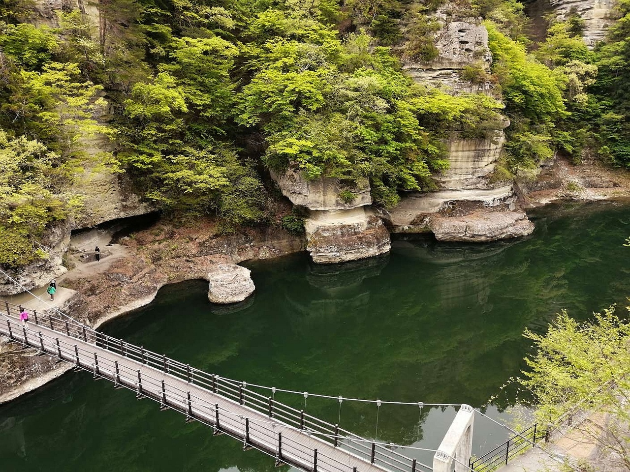 会津ぐるっとカードを利用して、会津田島駅から塔のへつり駅まで乗車し、塔のへつりを観光しました。会津田島駅から会津若松駅までの間の見どころといえば、芦ノ牧温泉や湯野上温泉、大内宿ですが、駅から徒歩で観光できるのは塔のへつりかなぁと思います。奇岩と緑の川、そして橋のコントラストは素晴らしいです。その緑の川が阿賀川です。
