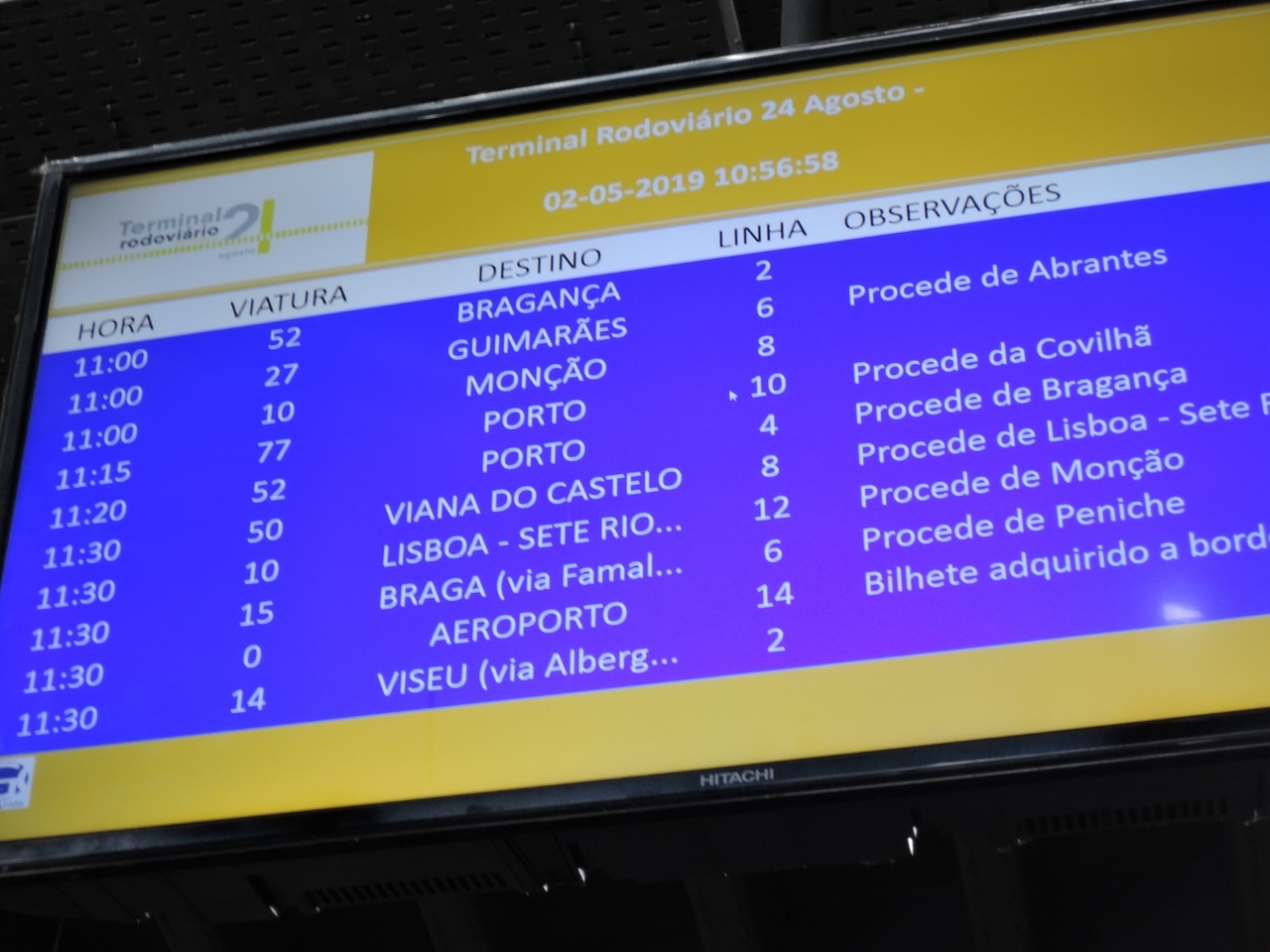コインブラからポルト、ポルトからリスボンと二回利用しました。電光掲示板に行き先とバスの乗り場の番号が出るので分かりやすいです。トイレもあり、50セントでした。バスは5分くらい前にしか来ません。荷物は両側から入れることができます。乗り心地も良いので、私は電車よりバスを利用しました。