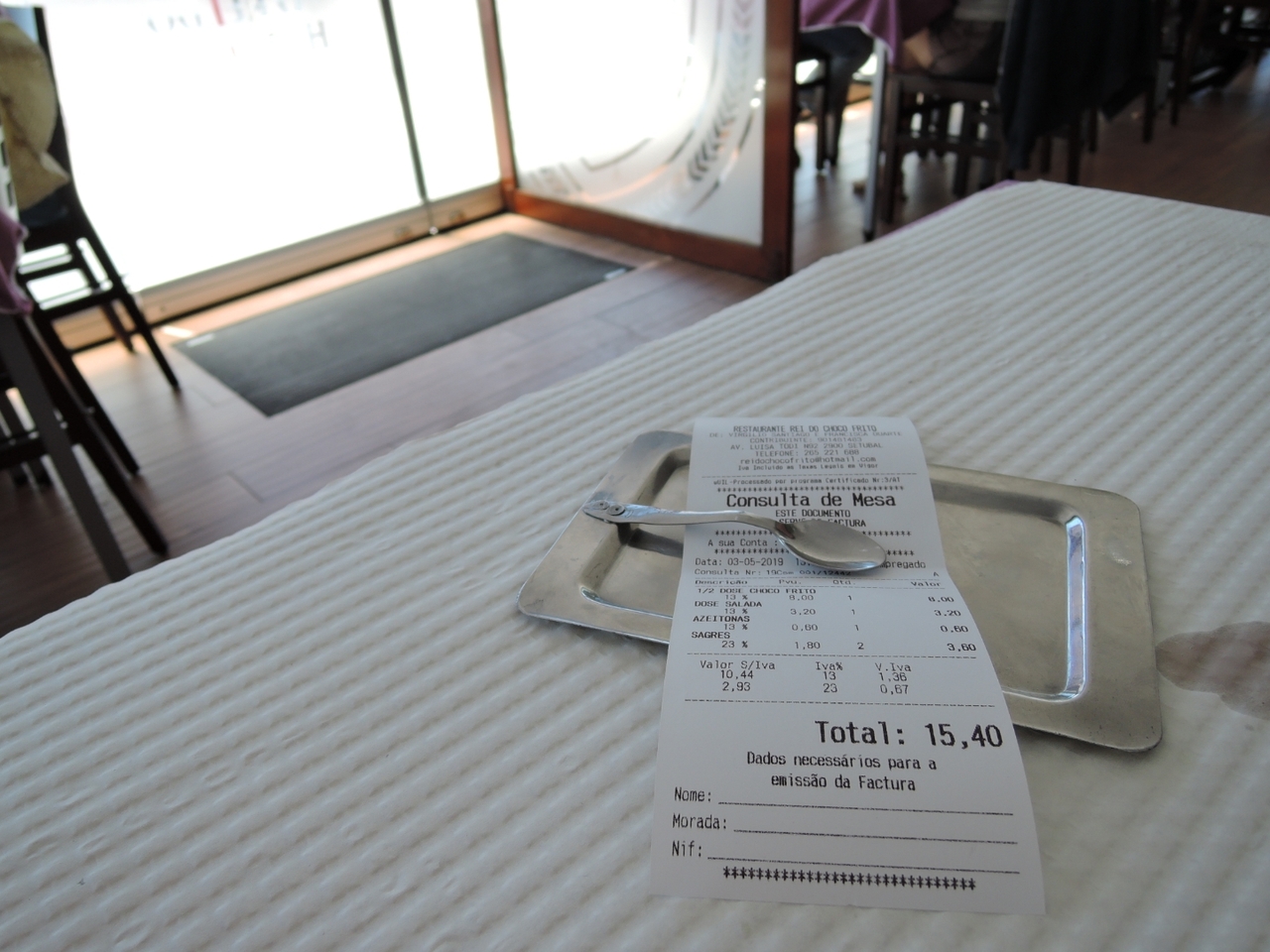 セトゥーバル名物のチョコフリット(モンゴウイカのフライ)が有名なお店なので、訪問しました。12時オープンで、12:30頃入店しましたがほぼ満席で、私たちより後の人たちは外で待っていました。みなさんフライドポテトとチョコフリットとサラダをオーダーしていました。私たちはサラダとチョコフリットのメーアドーセ(1/2)とビールをオーダーしました。ちょうどよい量でした。回りを見ると、結構フライドポテト等残している人が多かったです。15ユーロ程度でお安かったです。