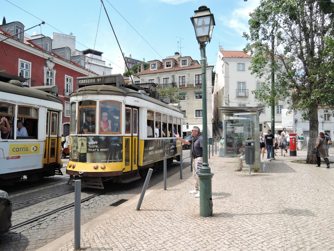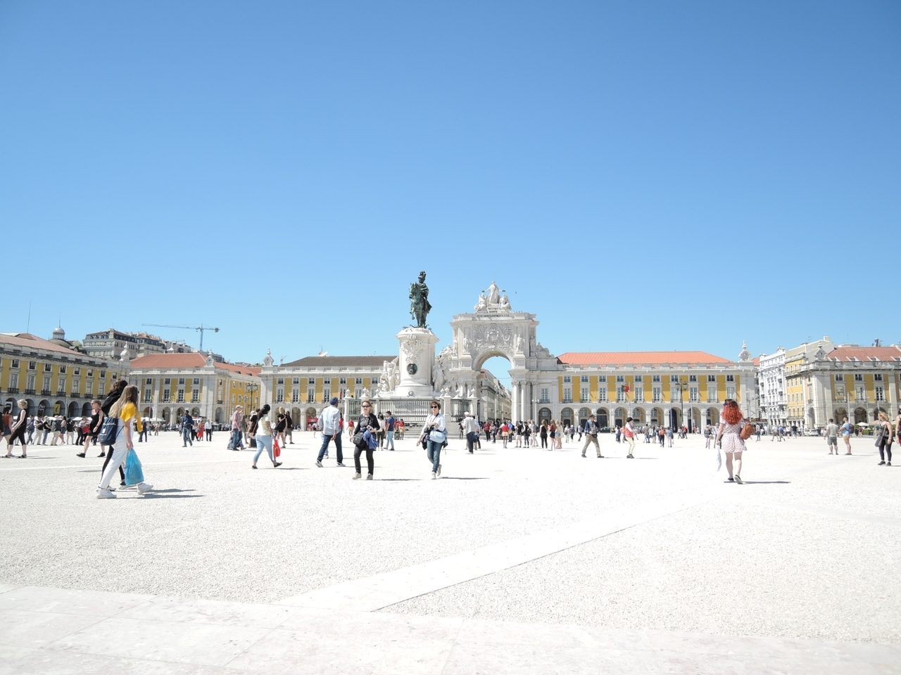 ここからの眺めが、私の中ではリスボンで一番好きです。お天気のいい日だと、より一層解放感があり、青空とオレンジ屋根と白い建物、そして海がとても映えます。トゥクトゥクの発着所になっているのか、たくさん並んで停まっています。観光用トラムも普通のトラムも停留所があるので、交通の便も良いです。