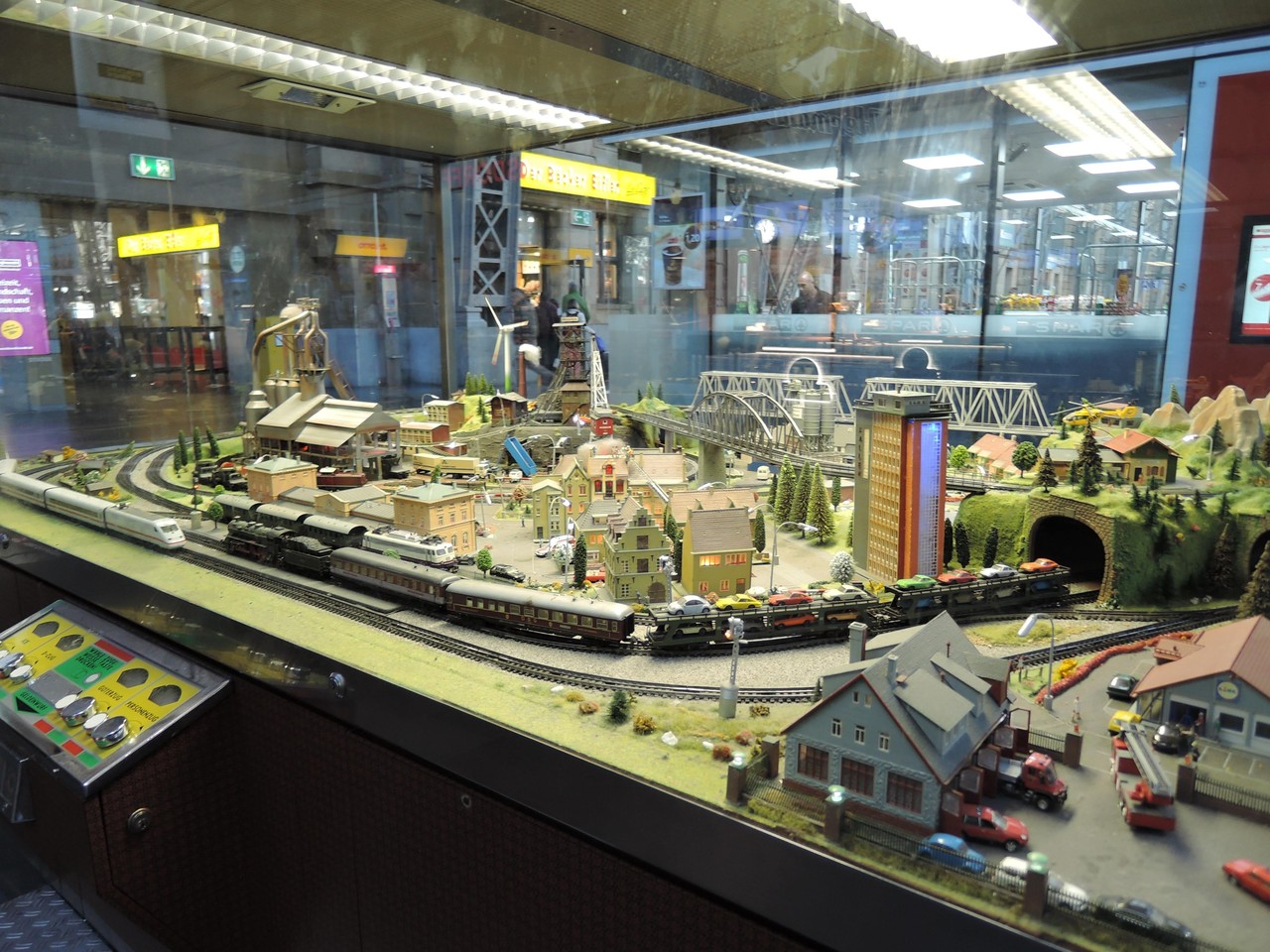フラットな駅なので、スーツケースを伴った移動でもとても楽です。食べ物や飲み物をテイクアウトできるお店もたくさんあるので、長時間の列車移動の前後は便利です。駅の一角にドイツの町並みのミニチュアが飾られています。ハンブルクのミニチュアランドを思い出しました。せっかくなので見て行ってください。