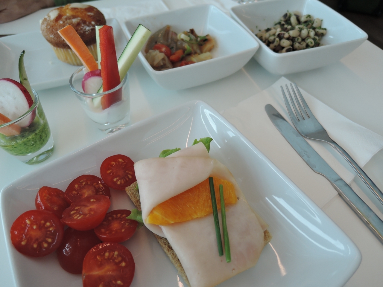 13時頃訪れましたが、混雑していて座席確保がギリギリでした。野菜スティックや、豆のサラダ、カナッペ等、おしゃれな感じのフードがありました。フードコーナーとは別にバーカウンターもあり、アルコールはそちらでオーダーできます。
