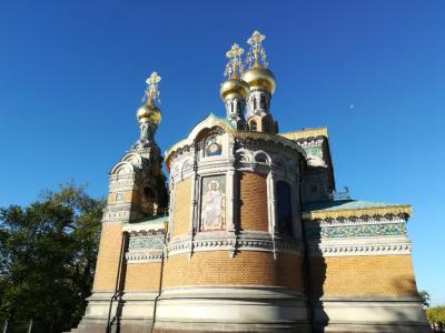 マチルダの丘へバスで到着し、工事中の結婚記念塔の横を通っていると、とても美しくきらびやかに輝くロシア教会が目に入ってきました。アールヌーボー建築をお目当てに訪問しましたが、とても美しかったです。ドイツにお住まいのロシアの方等が訪れられていました。