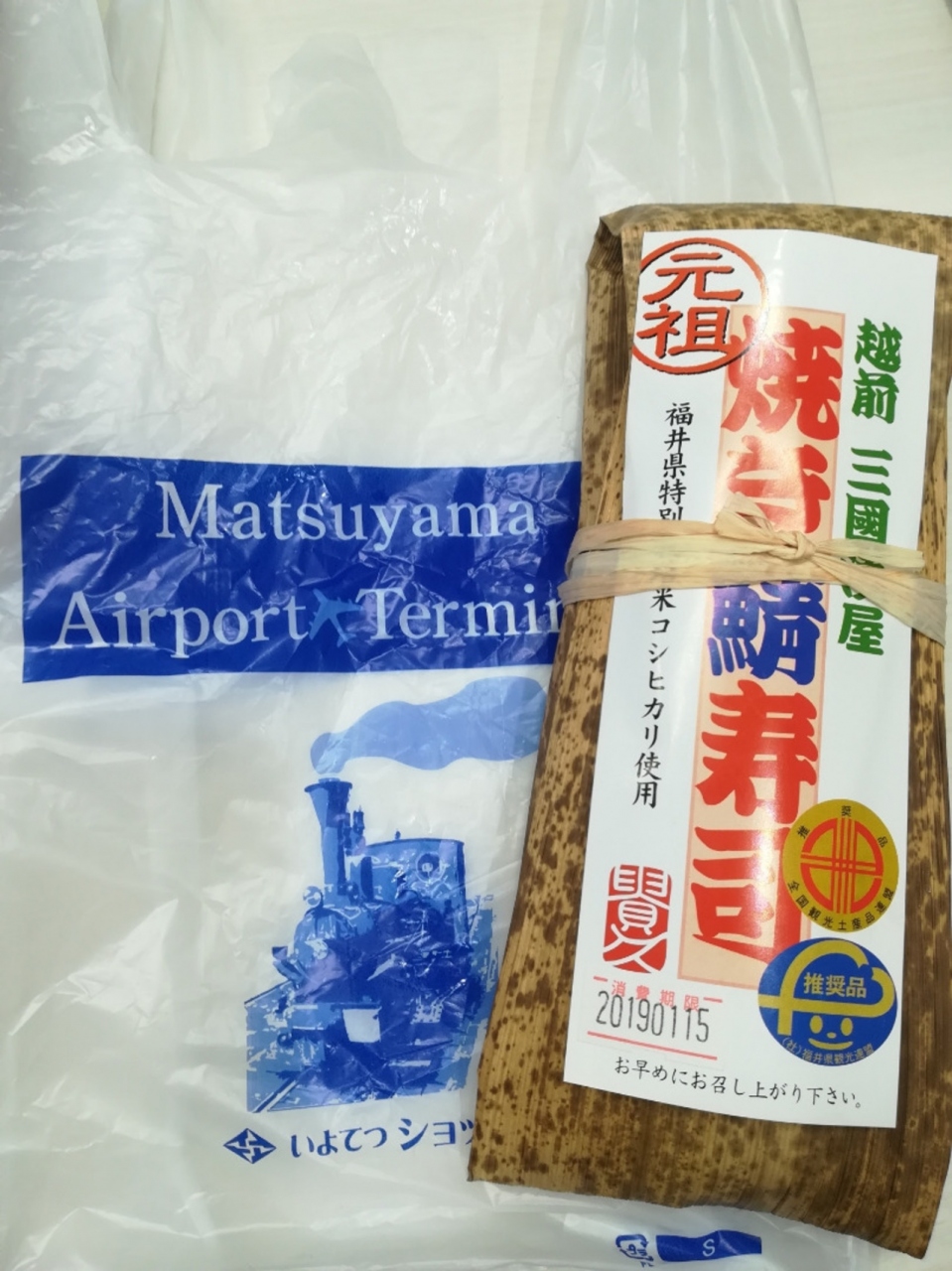 松山名物がたくさん揃っています。特にじゃこ天については、たくさんの種類を販売していました。たまたま試食販売をしていた焼鯖寿司が美味しかったので購入したのですが、全く松山には関係のない福井県の名物でした(笑)