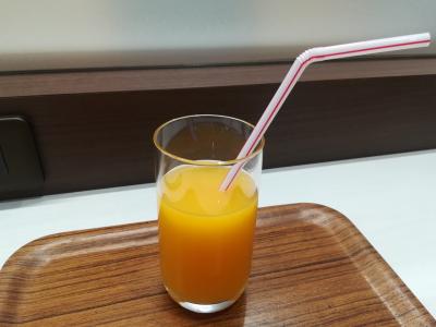 松山空港はあまり大きくない空港ですが、カードラウンジが2つあります。こちらのラウンジのソファー席は、隣の席との間に仕切りがあるので、比較的パーソナルスペースは守られます。ポンジュースに似た柑橘系のジュースがありました。