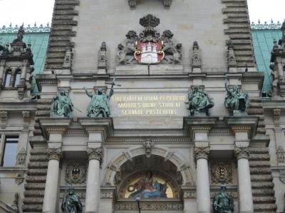 彫刻もきちんと施されていて、細かいところも素晴らしかったです。ハンブルクの紋章も立体感がり豪華です。「先人たちの勝ちとった自由を後世の人々が厳粛に守らんことを」と書いてあるそうです。守護神のフレスコ画も美しかったです。調べてみると意外に遅く19世紀の建物のようでした。地下鉄の駅のすぐそばなので、どこかへ行かれる際には必ず見られるといいと思います。