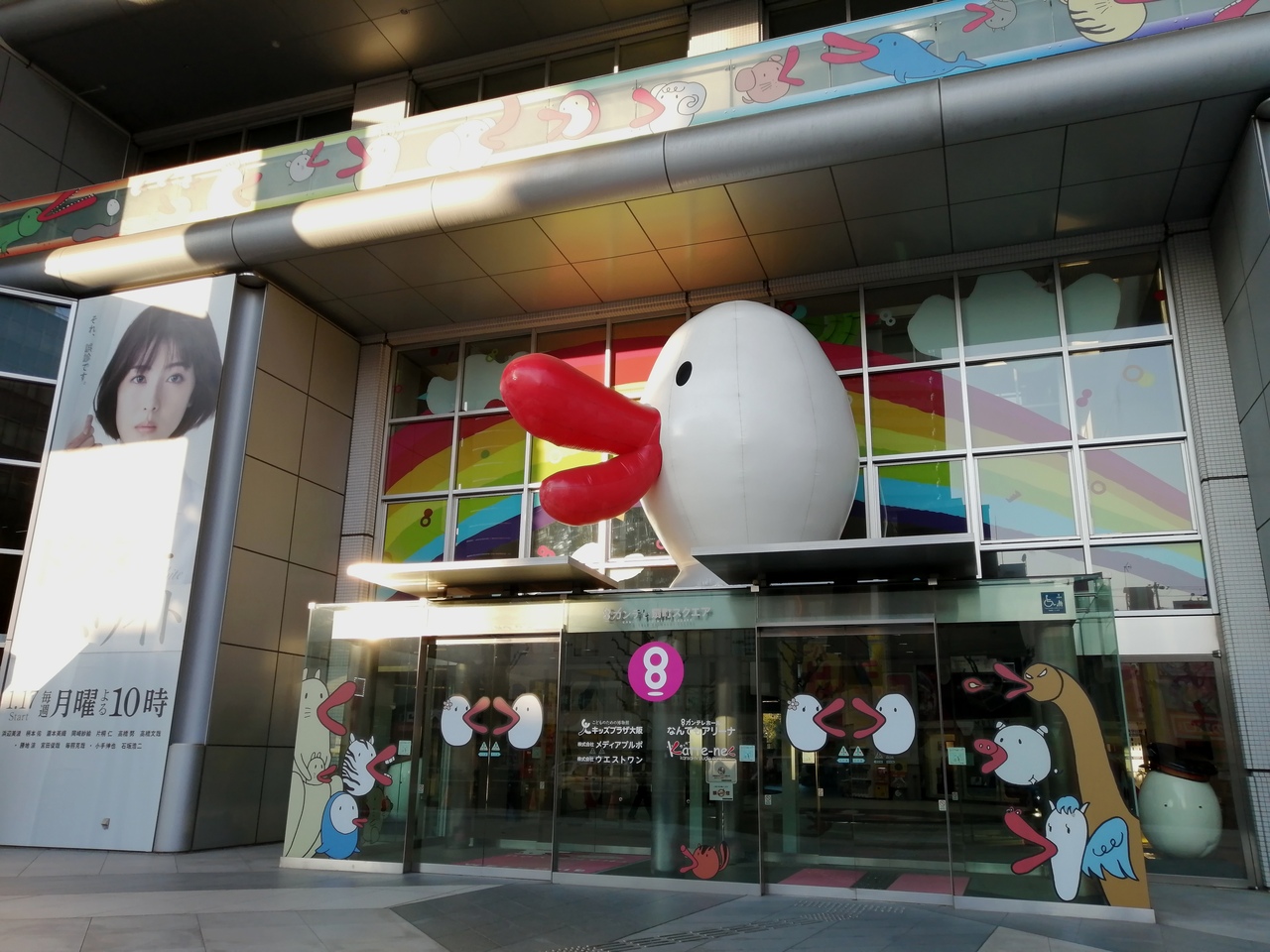 扇町駅もしくはJR天満駅からすぐのところにある、大きくて派手な外観のビルです。ハチエモンというキャラクターや、その時オンエアーされているドラマやバラエティの番組のポスターが大きく飾られているのですぐ分かると思います。