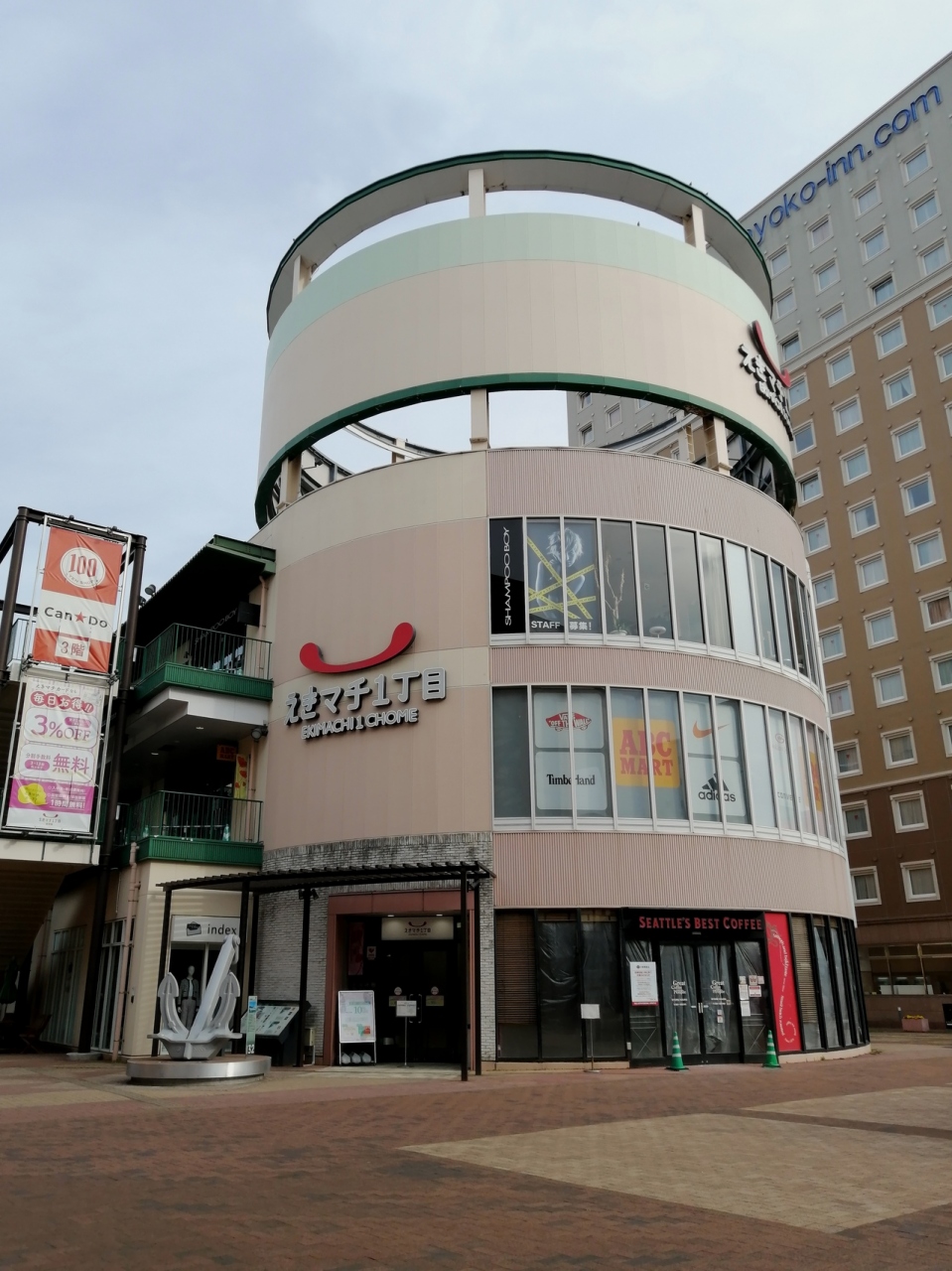 佐世保駅の改札を出て右側(海ではない街側)の出口を出ると、すぐ丸い筒のような建物が目に入ります。チェーン店のカフェやフィットネスクラブなどが入っています。100円均一のお店もあるので、忘れ物をしたとき等役に立ちます。