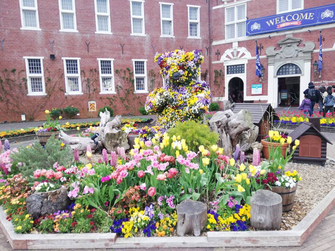 ハウステンボスに入場すると一番最初にあるアトラクション?!です。入口の前には、お花でテディベアが作られていて、とてもかわいくフォトスポットになっていました。テディベアの銅像にも花飾りが付けられていました。