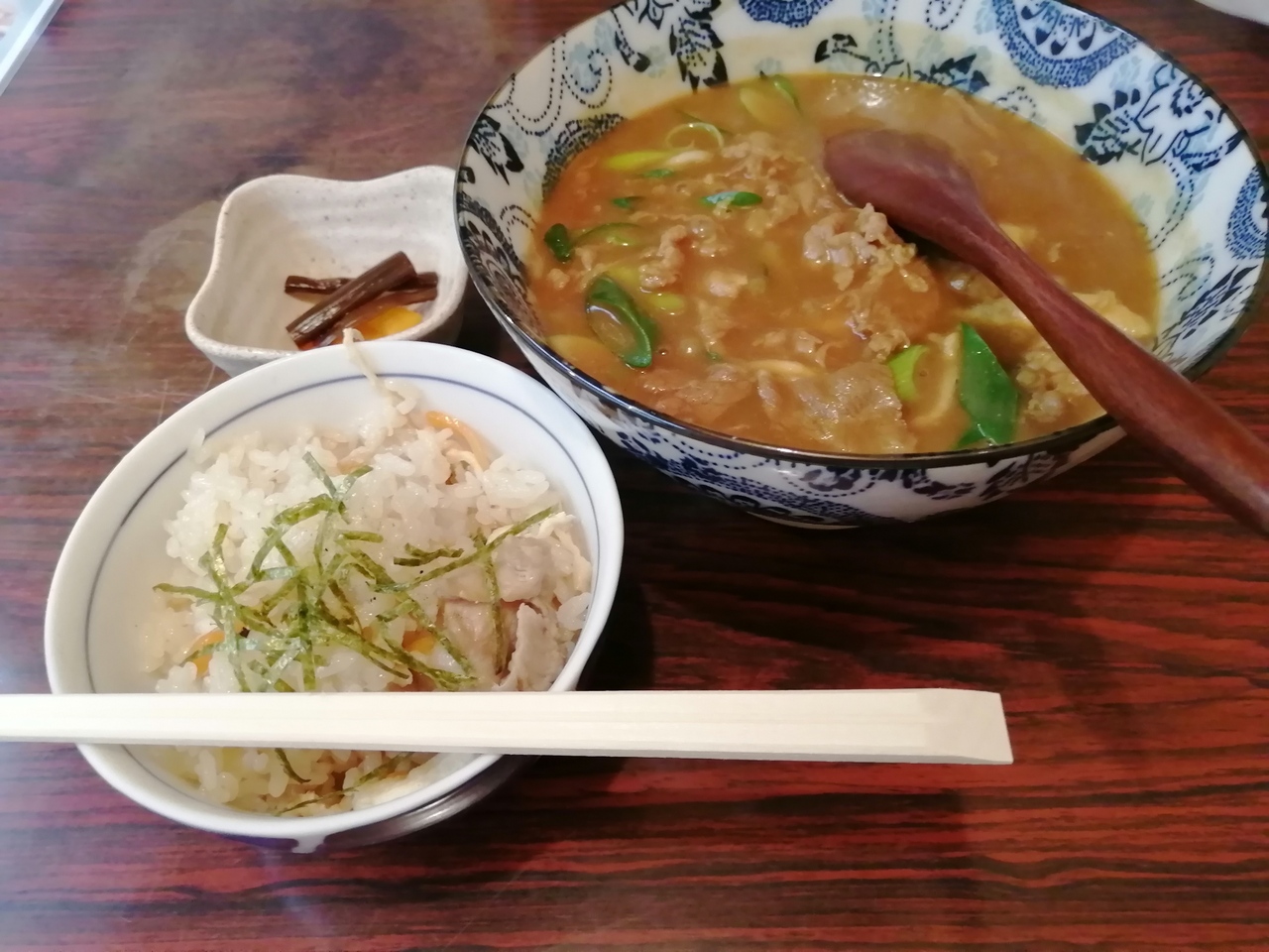 平日の11時半すぎに伺いました。すでに常連と思われる近隣の会社員の方たちが数名いらっしゃいました。カレーうどんと色めし(かやくご飯)のランチセット700円をオーダーすると、まもなく運ばれてきました。なかなか早いので有り難いです。きゃらぶきとたくあんも付いてきます。コスパよしです。