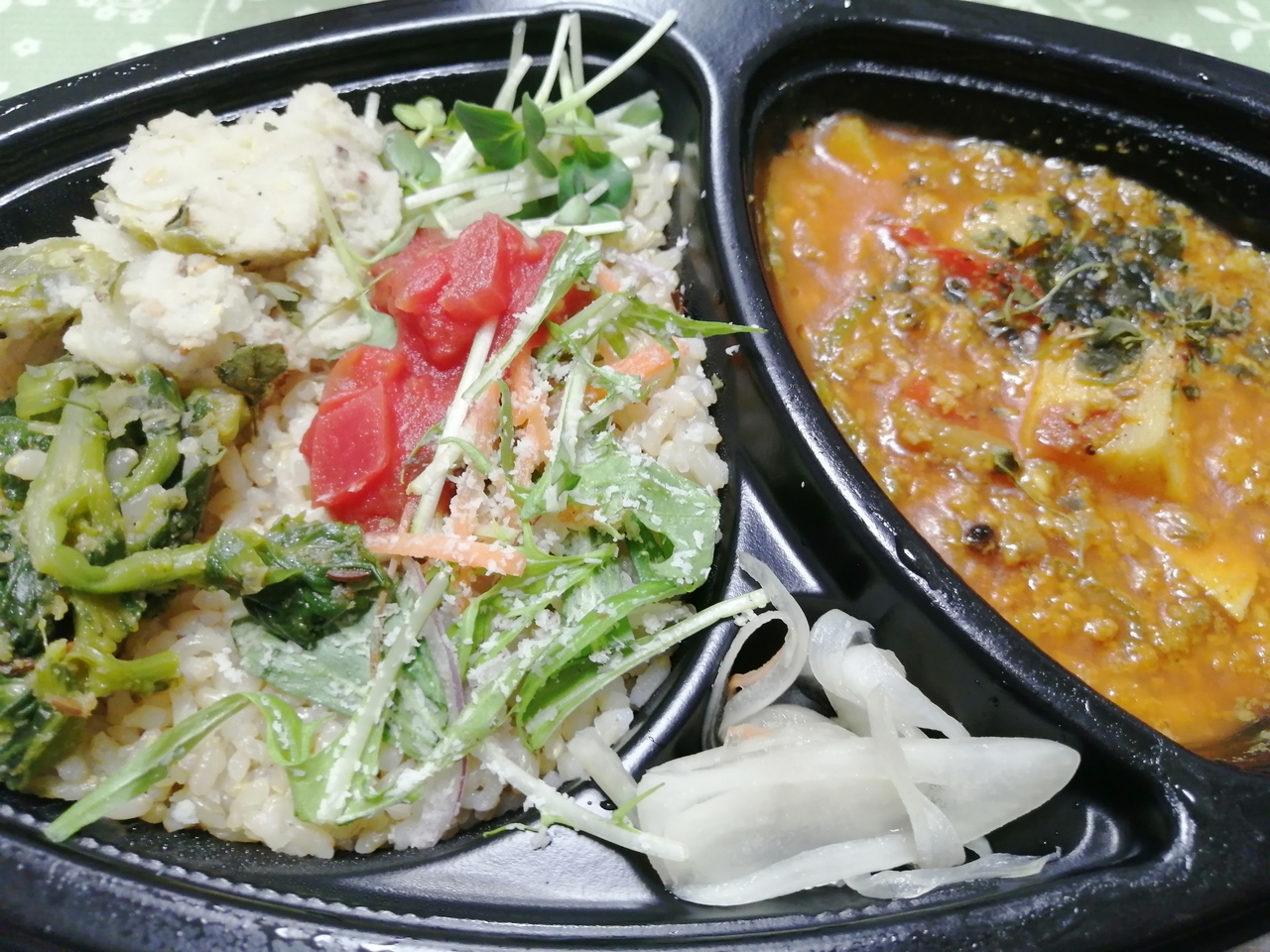 連日行列のカレー店です。昼休みにはなかなか時間がないため、テイクアウトし夜に自宅で食べました。日替わりのカレーが3種類あり、すでにパックに詰めてあったものを購入さました。店員さんに3種類の中では一番辛いですと言われましたが、スパイシーでしたが問題なかったです。特にカレー好きと言うわけではないので口コミを書きづらいですが、お野菜やお肉のバランスもよいので、近くに来られて時間があればぜひ。